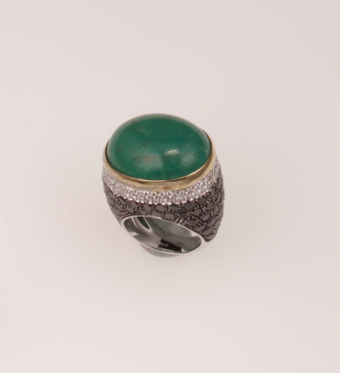 Anello con smeraldo taglio cabochon e diamanti bianchi e neri