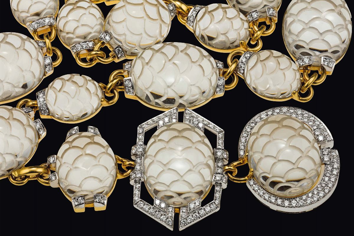 David WEBB. Parure composta da collana, bracciale ed orecchini in cristallo di rocca e diamanti