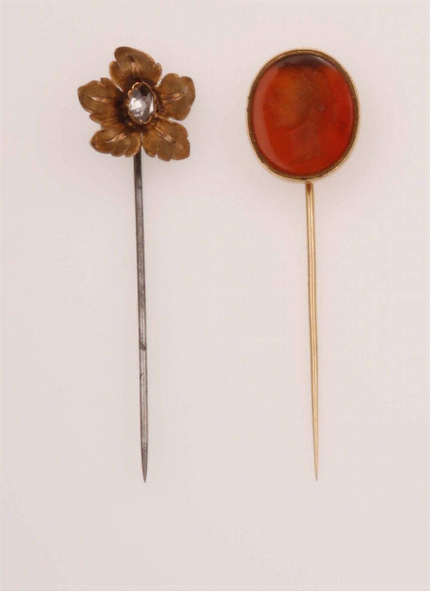 Due spille da cravatta, una con cammeo su corniola ed una a soggetto floreale con rosa di diamante