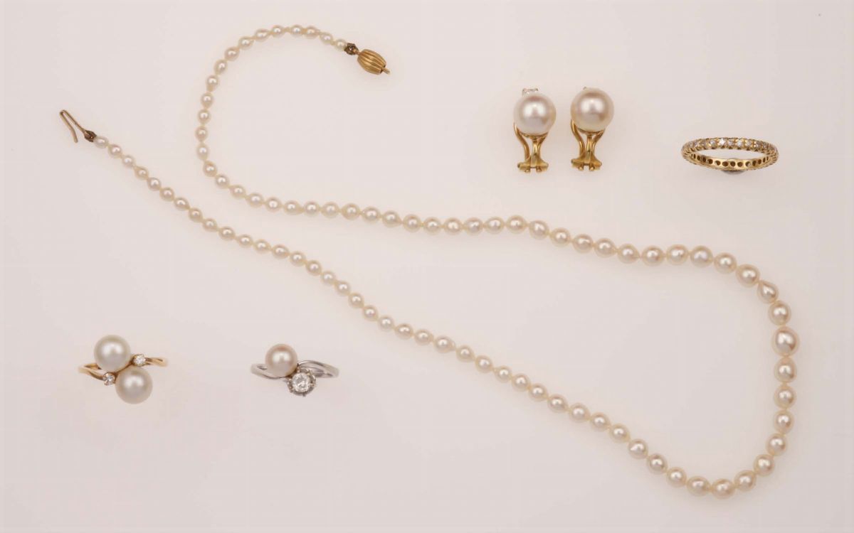 Lotto composto da una collana di perle naturali, tre anelli ed un paio di orecchini con perle