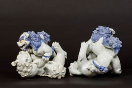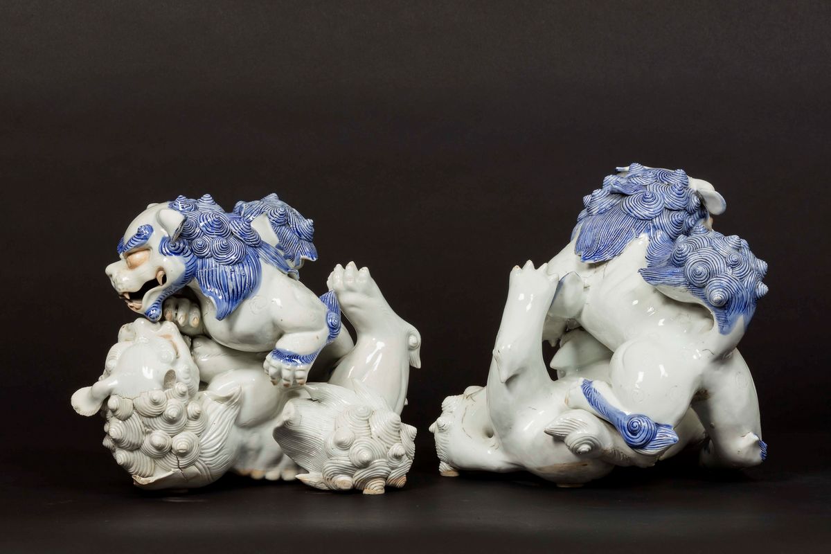 Coppia di cani di Pho in porcellana blu e bianca con occhi e denti lumeggiati in oro, Giappone, Hirado, XIX secolo