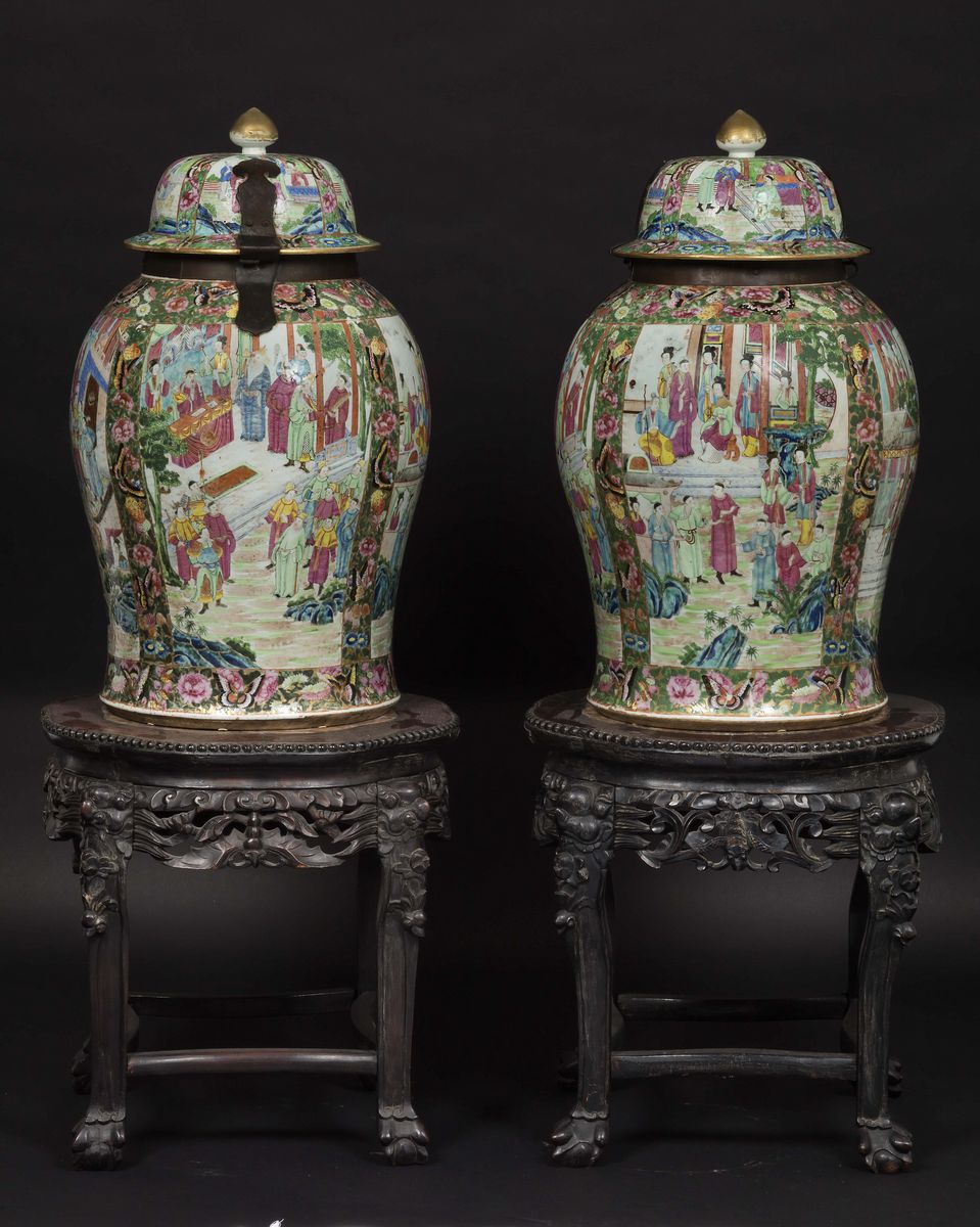 Coppia di potiches con coperchio in porcellana Canton con legature in bronzo e raffigurazioni di scene di vita comune poggianti [..]