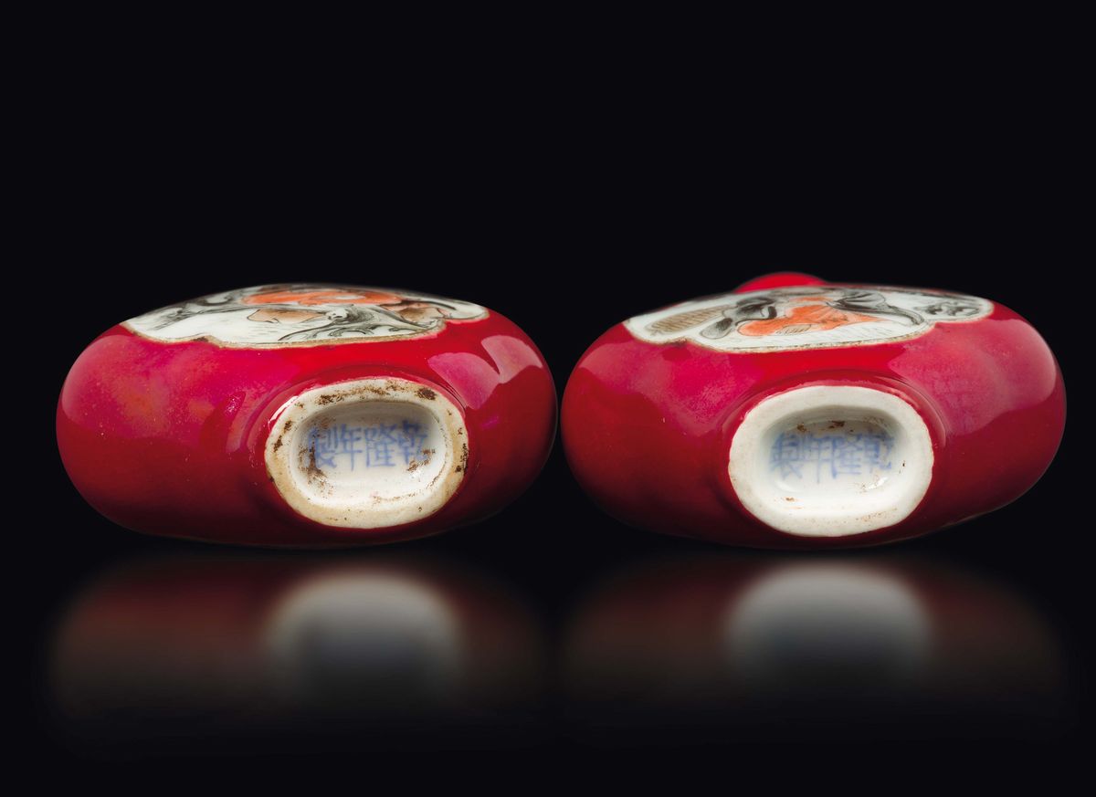Coppia di snuff bottles in porcellana rossa con riserve con saggi ed iscrizioni, Cina, Dinastia Qing, XIX secolo