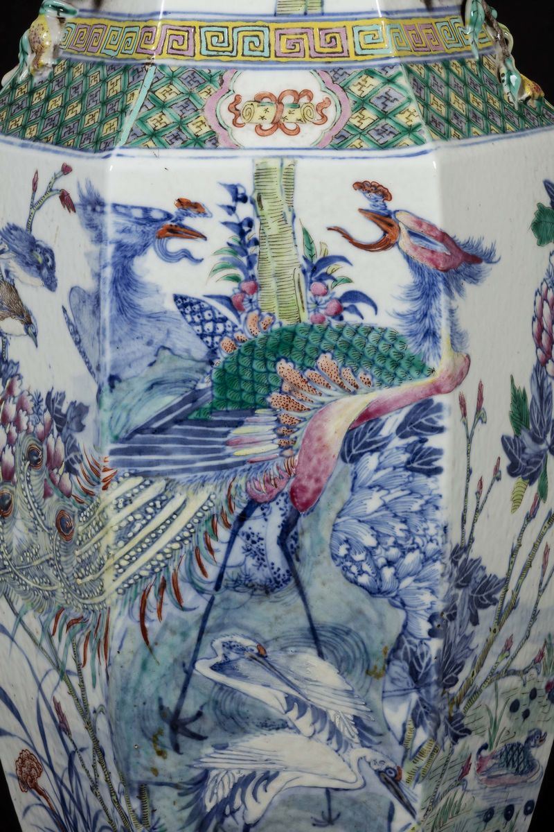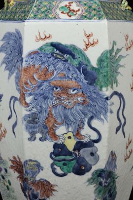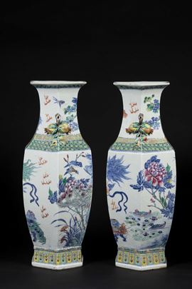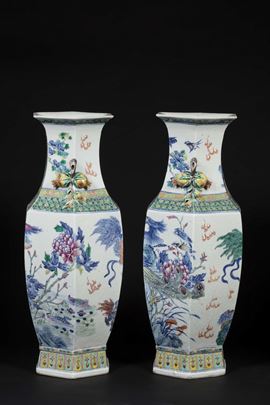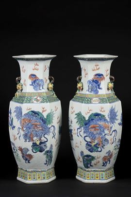 Coppia di vasi a balaustro in porcellana doucai con raffigurazione di fenici e cani di Pho, Cina, Dinastia Qing, XIX seco [..]