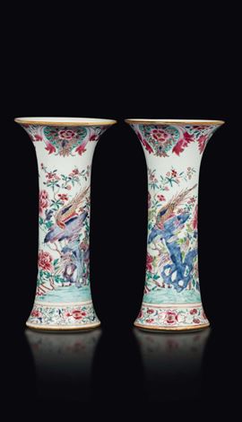 Coppia di vasi a tromba in porcellana Famiglia Rosa con motivi floreali, Cina, Dinastia Qing, epoca Yongzheng (1723-1735) [..]