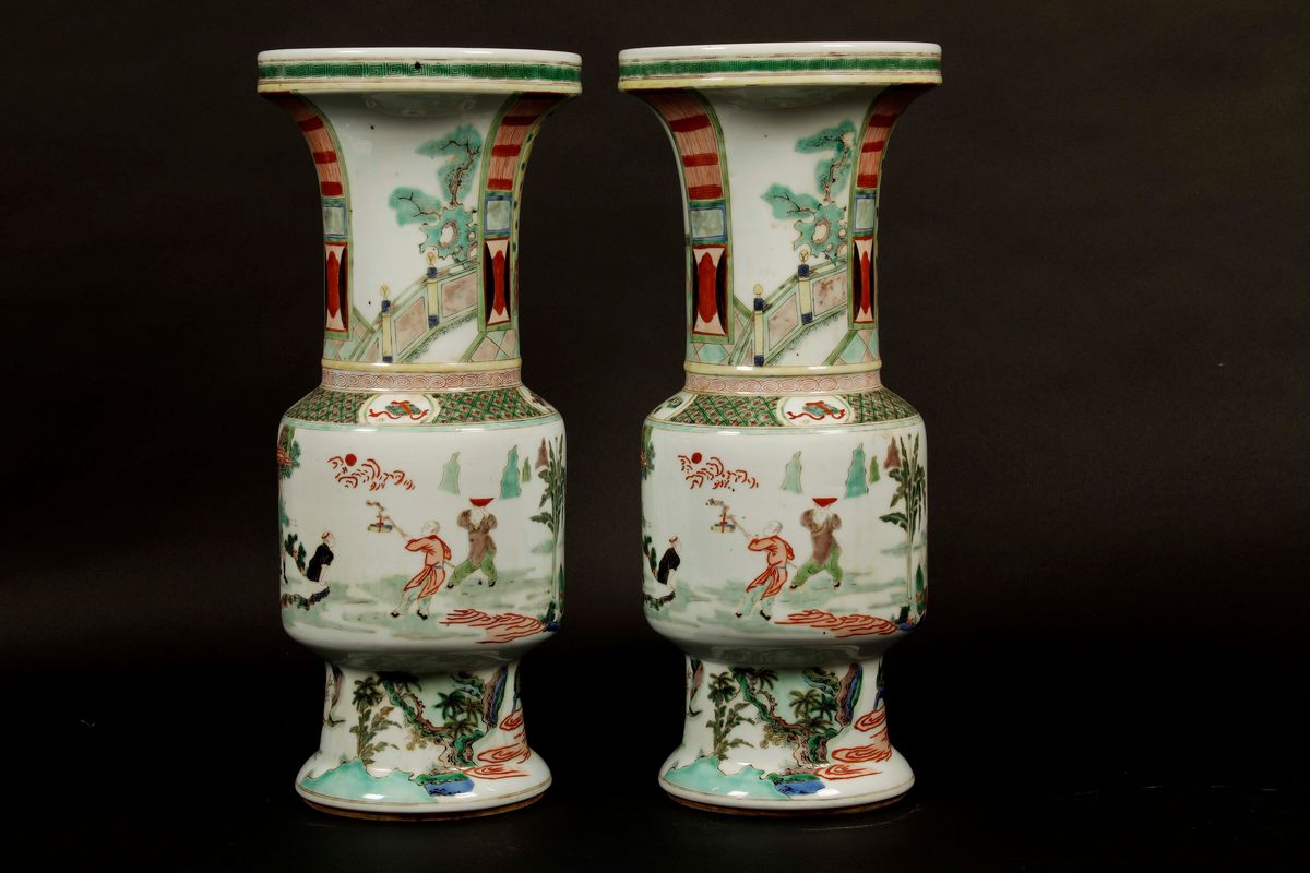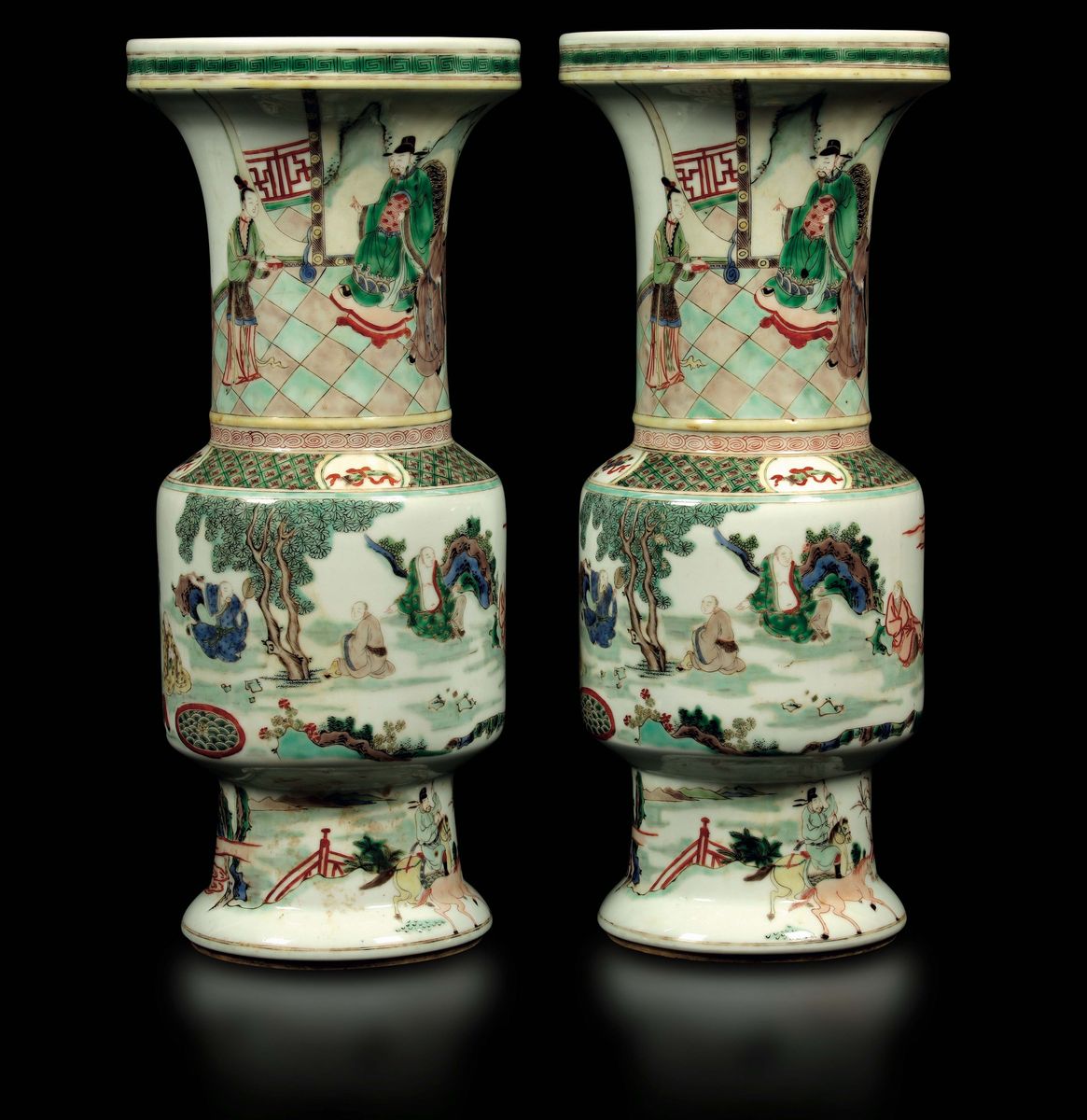 Coppia di vasi in porcellana Famiglia Verde con figure di saggi, Cina, Dinastia Qing, XIX secolo