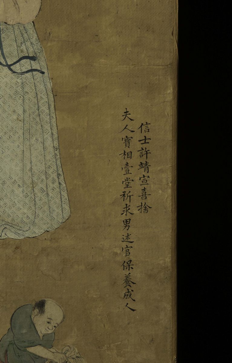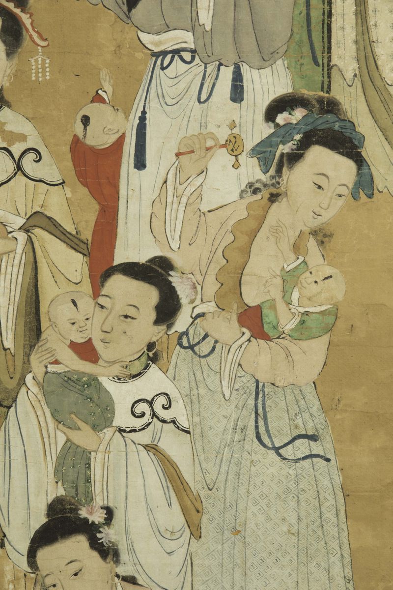 Dipinto su carta raffigurante la celebrazione dello spirito di cura dei bambini da parte della Signora della torre e del marito, Cina, Dinastia Qing, XIX secolo