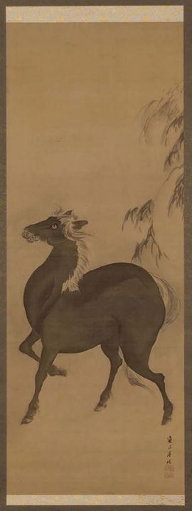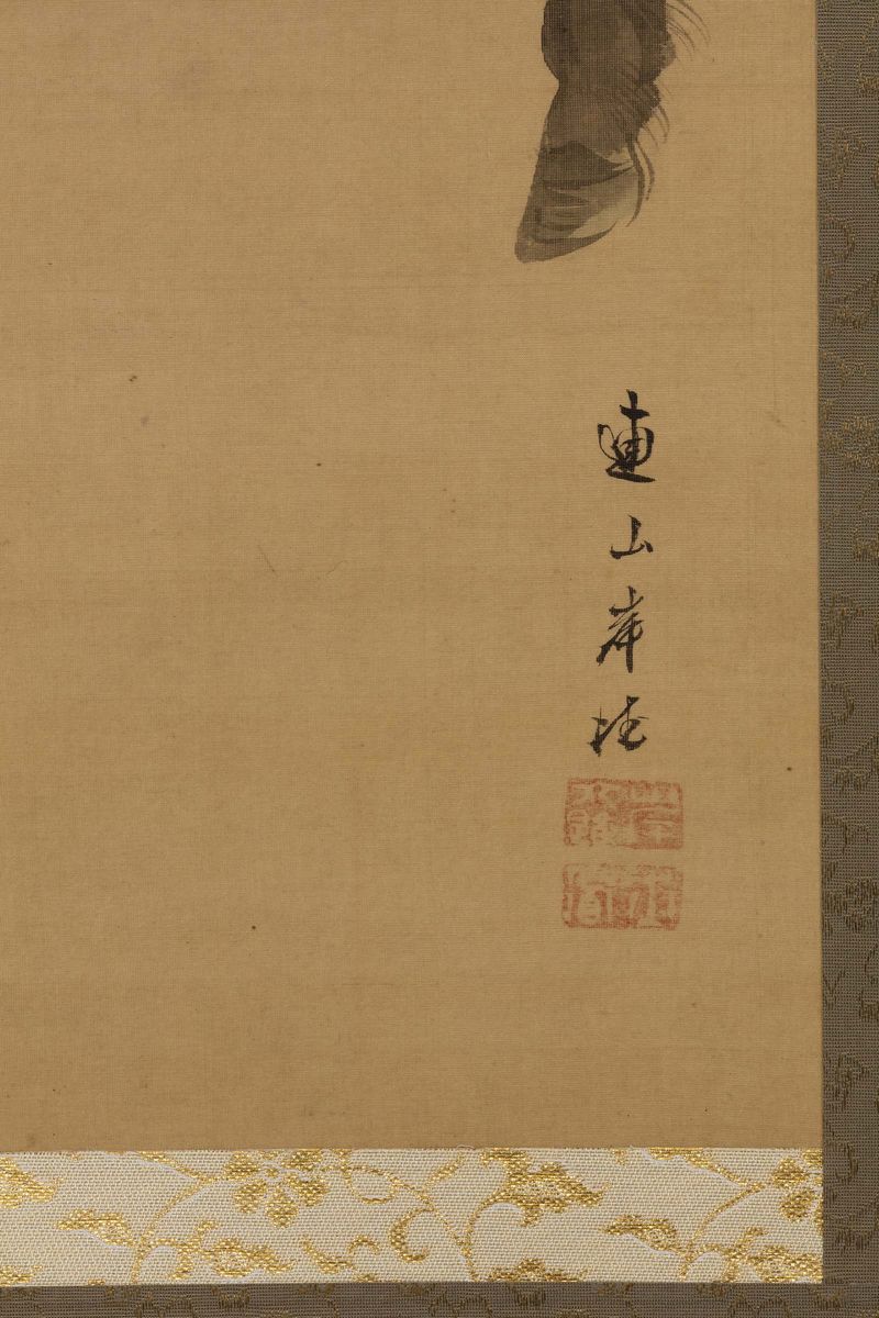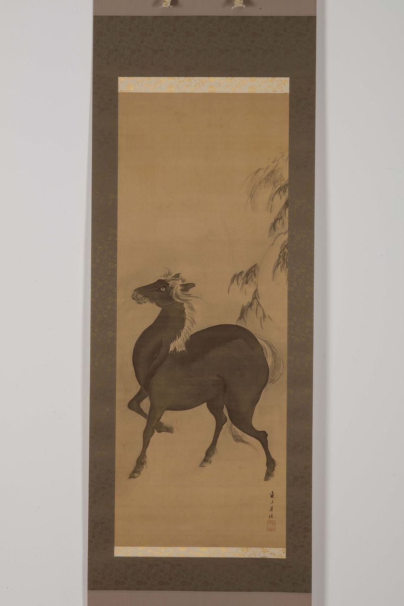 Dipinto su seta raffigurante cavallo, Giappone, firmato Renzan Gantoku (1805-1859)