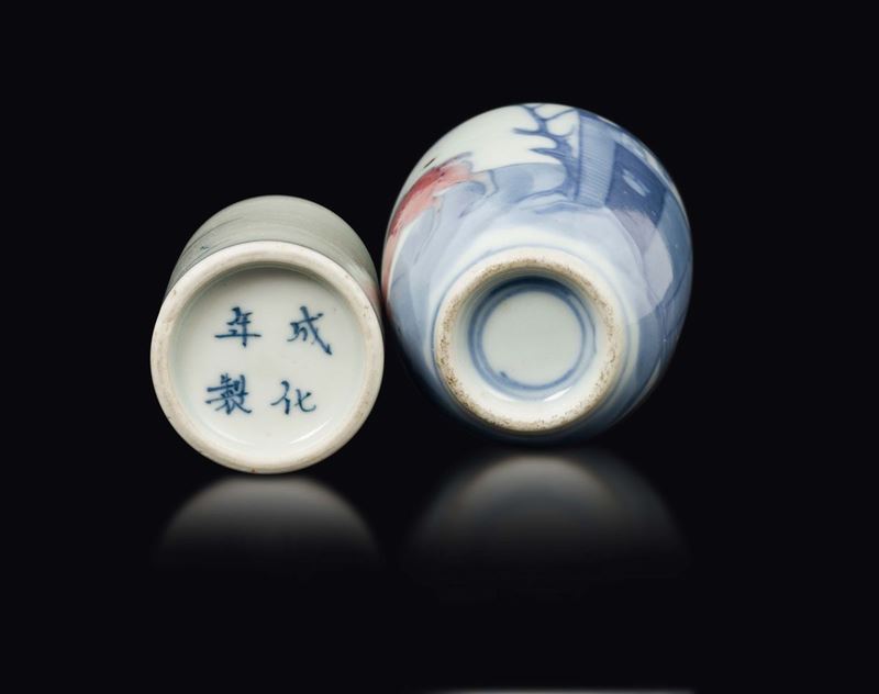 Due snuff bottles in porcellana bianca e blu con dettagli rosso ferro, Cina, Dinastia Qing, XIX secolo