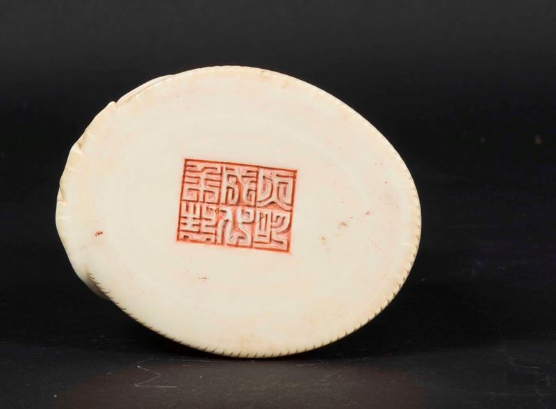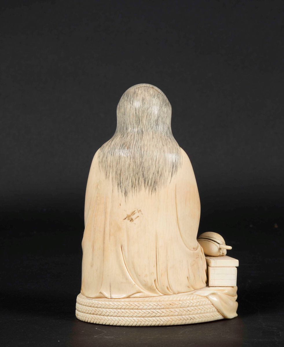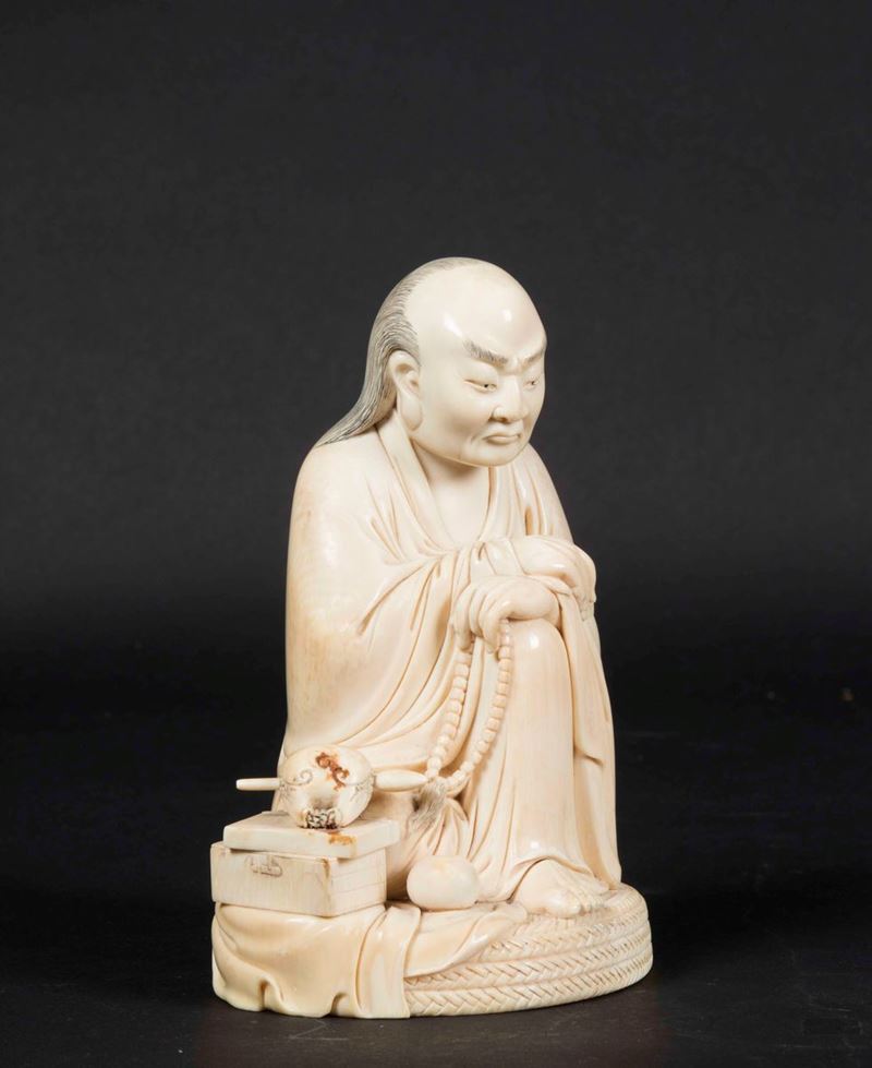 Figura di saggio seduto con collana da preghiera scolpito in avorio, Cina, inizi XX secolo