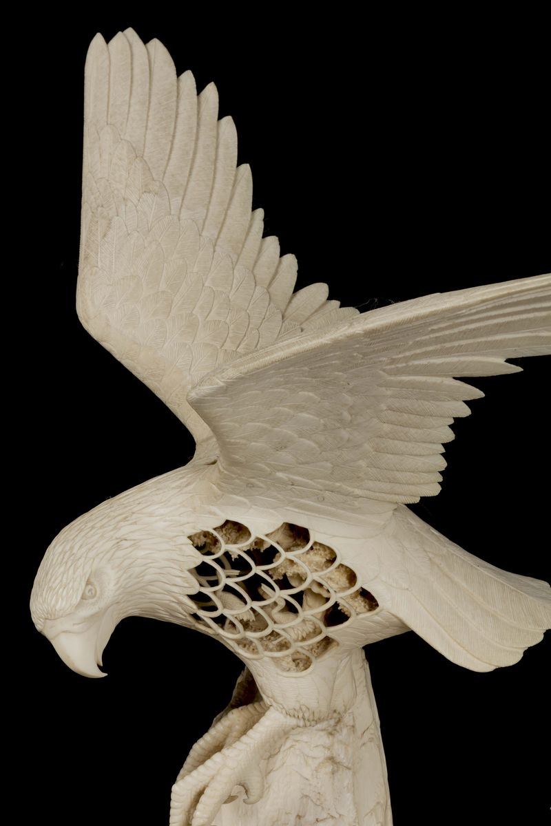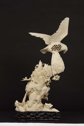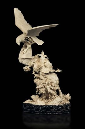 Grande gruppo in avorio finemente scolpito raffigurante aquila e paesaggio roccioso, Cina, inizi XX secolo