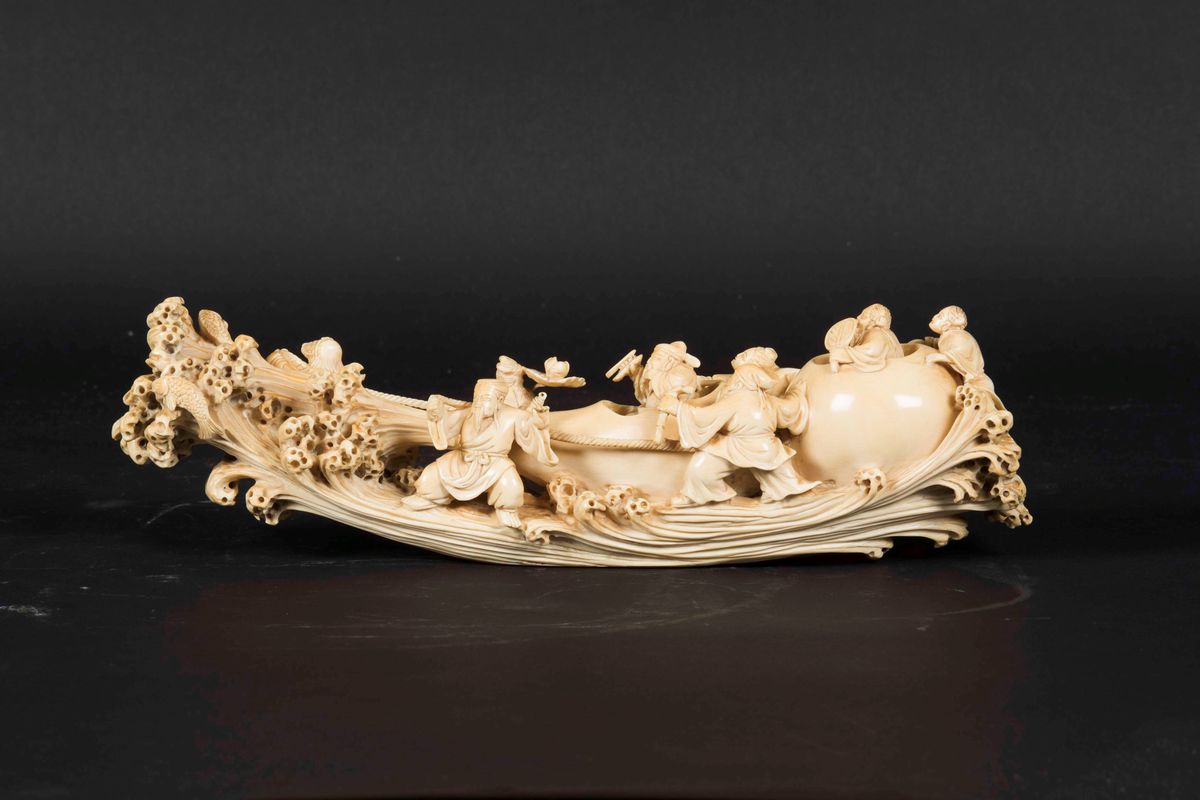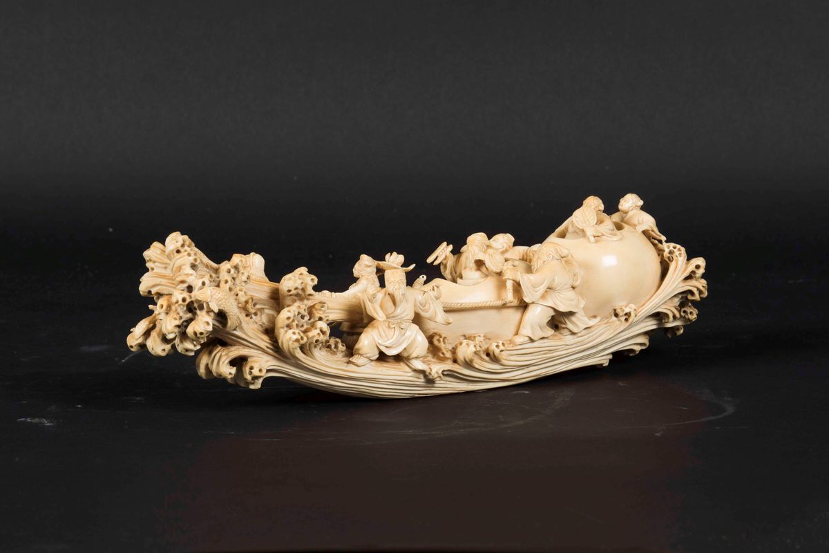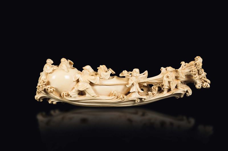 Gruppo in avorio scolpito con figure di pescatori su imbarcazione fantastica, Cina, inizi XX secolo