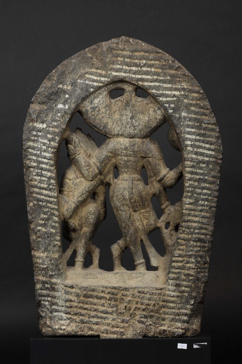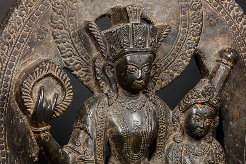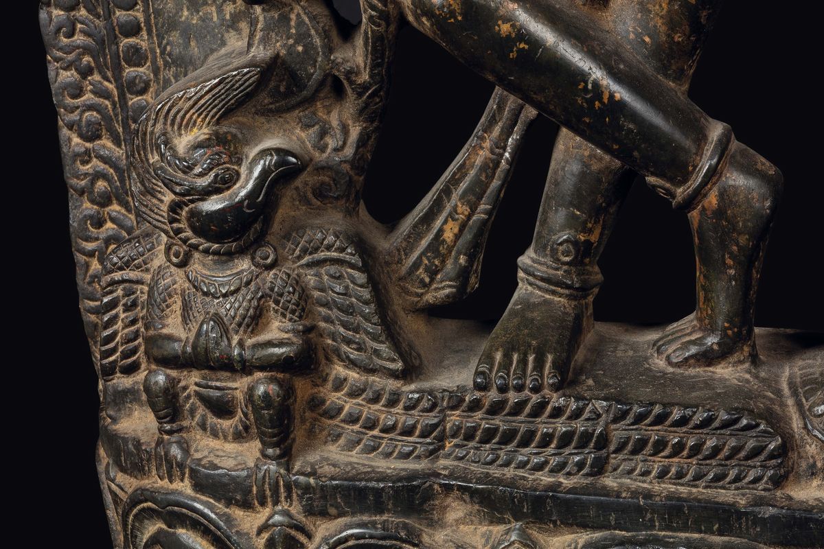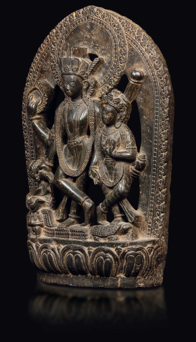 Importante stele in pietra raffigurante Visnu con Garuda e Laksi stante su tartaruga, Nepal, XV secolo