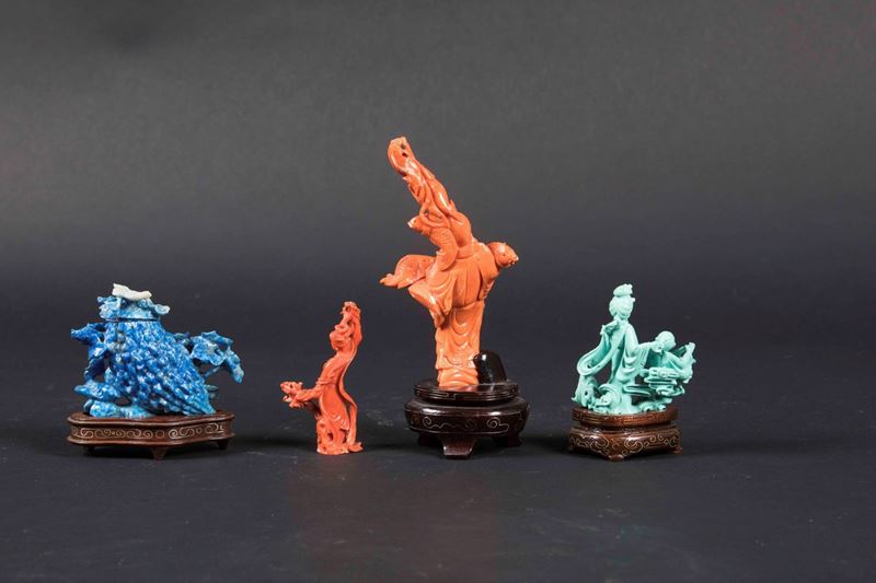 Lotto composto da figura di Guanyin e pescatore in corallo, figura di donna con bambino in turchese e vaso in lapislazzulo [..]