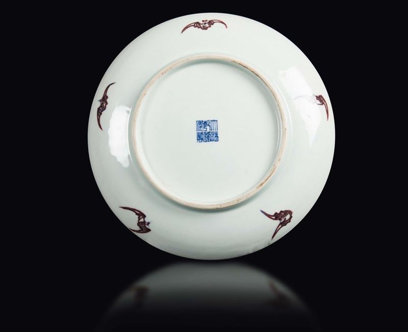 Piatto in porcellana bianca, blu e dettagli rosso ferro raffigurante capre al pascolo, Cina, Dinastia Qing, fine XIX