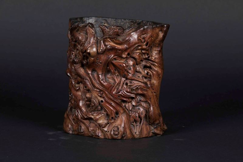 Portapennelli in legno di bamboo con raffigurazioni di animali, Cina, Dinastia Qing, epoca Kangxi (1662-1722)