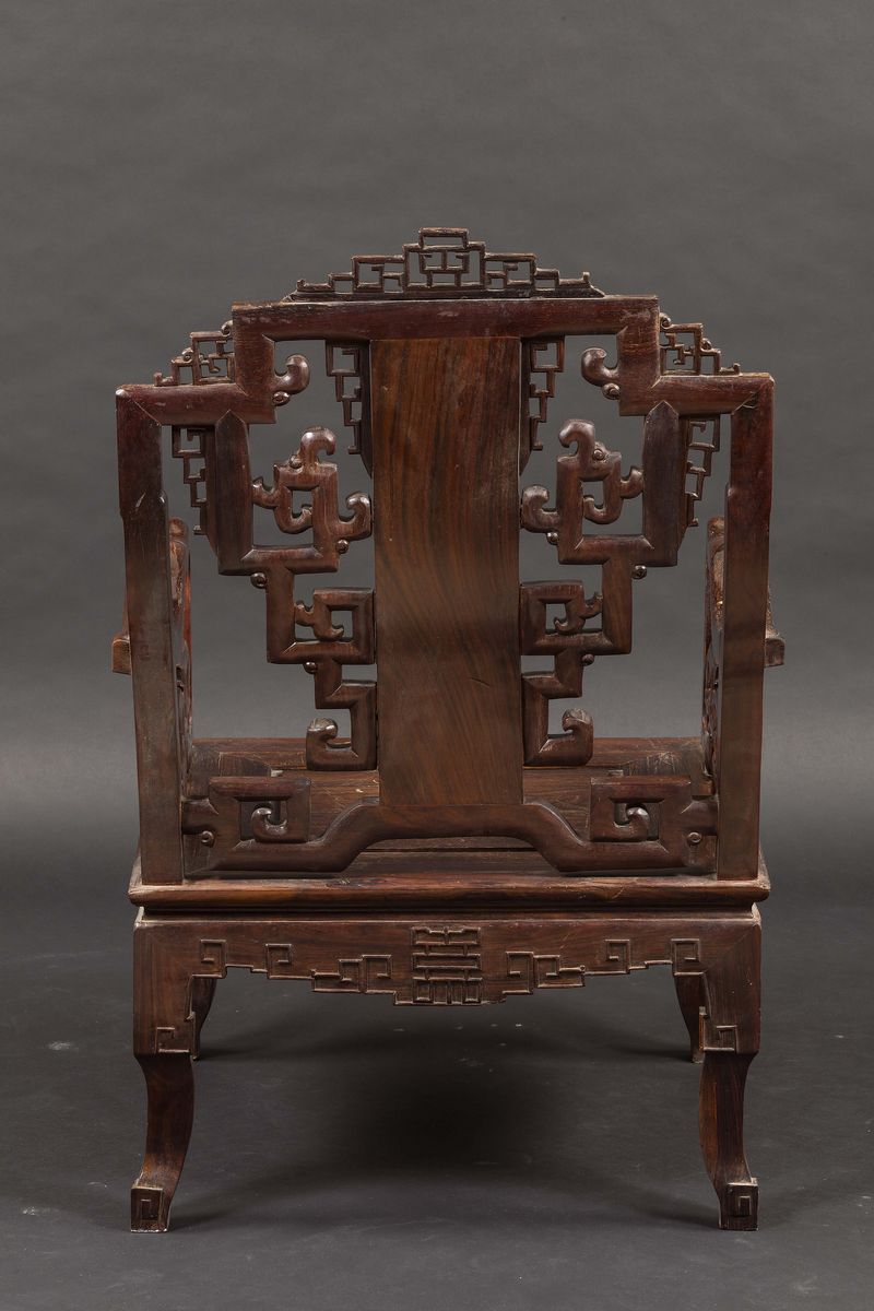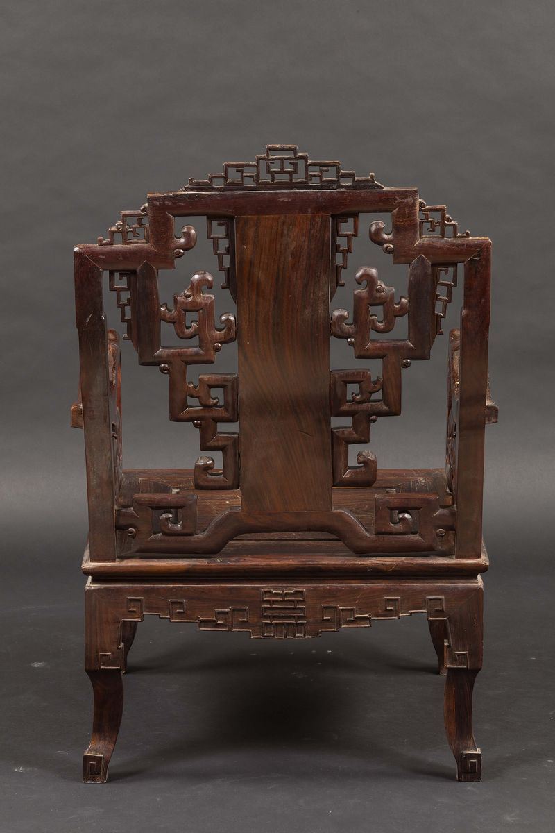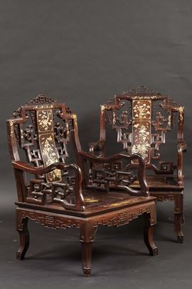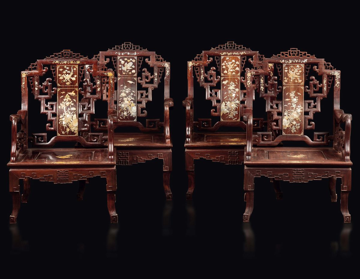 Quattro poltrone in legno di Homu con inserti in madreperla e raffigurazioni naturalistiche, Cina, Dinastia Qing, XIX sec [..]