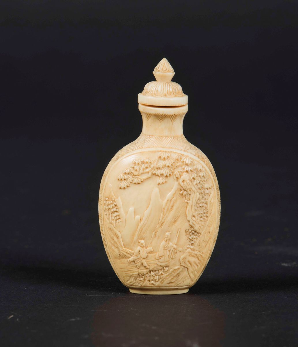 Snuff bottle in avorio finemente intagliata con personaggi entro paesaggio, Cina, Dinastia Qing, XIX secolo