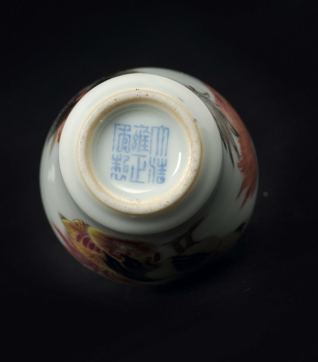 Snuff bottle in porcellana a smalti policromi con immagini di galli, Cina, Dinastia Qing, XIX secolo