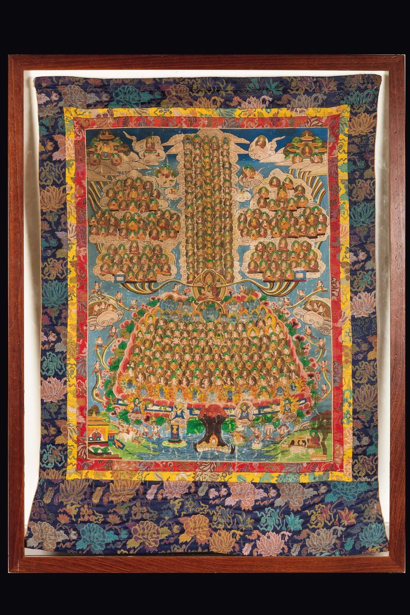 Tanka con divinità e figura di Lama centrale entro cornice, Tibet, XIX secolo
