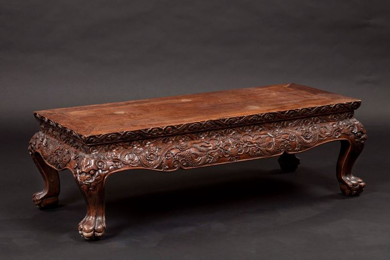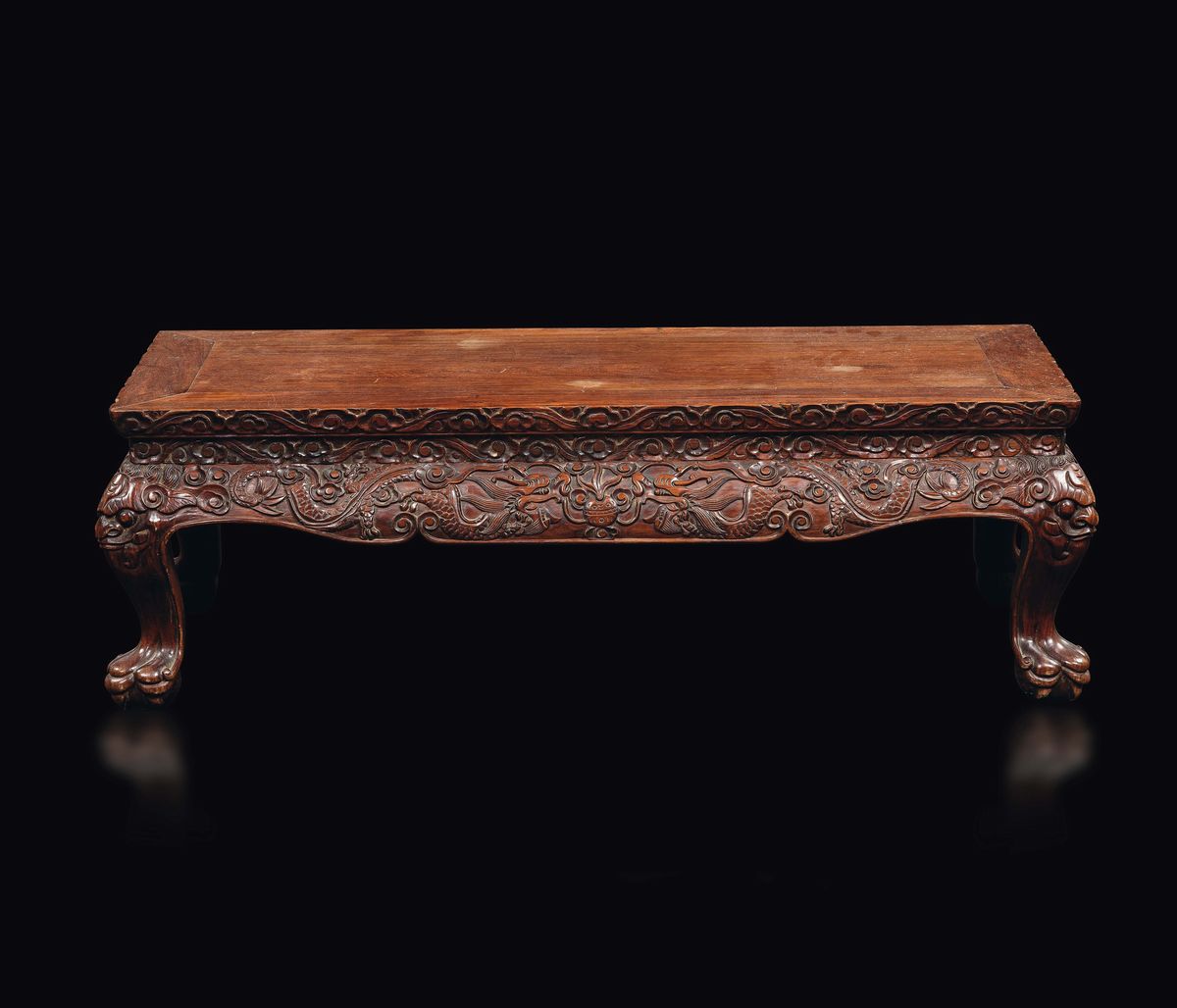 Tavolino da tè in legno di homu con piedi ferini e intagli a soggetto naturalistico, Cina, Dinastia Qing, XIX secolo