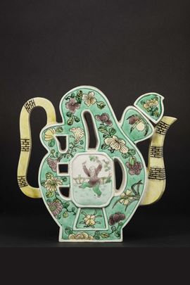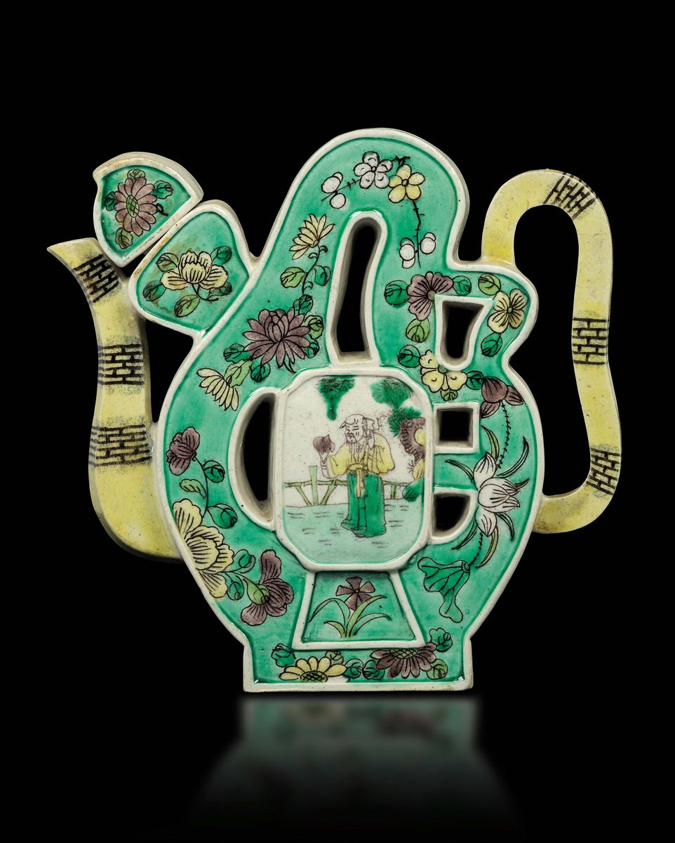 Teiera in porcellana smaltata a forma di ideogramma con figure di saggio e bambini, Cina, Dinastia Qing, epoca Kangxi (1662-1722)