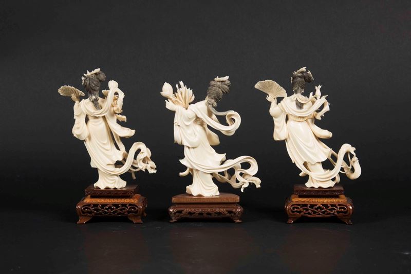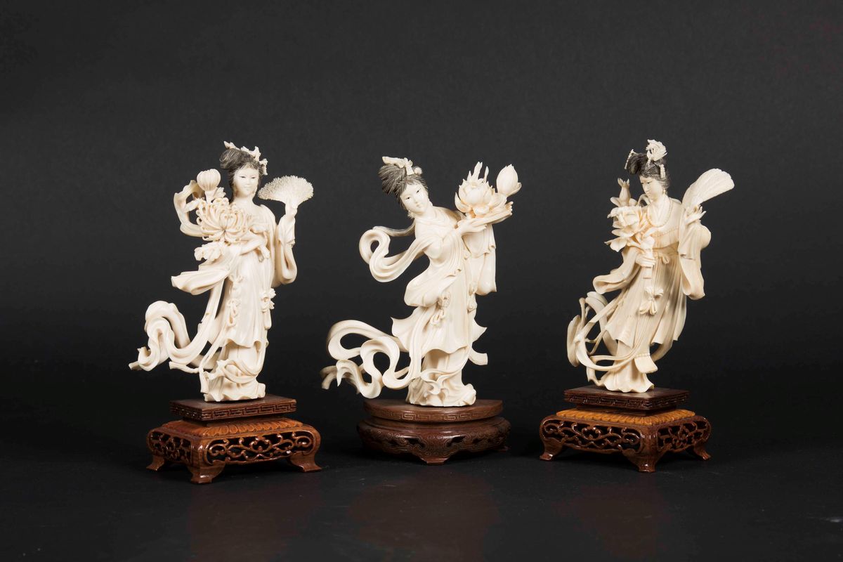 Tre figure di Guanyin con ventaglio e fiori in avorio scolpito, Cina, Repubblica, inizi XX secolo