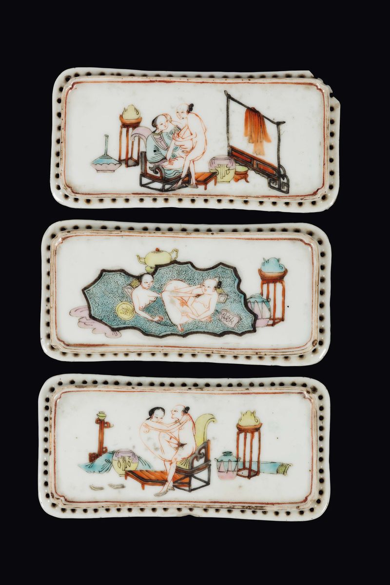 Tre placche in porcellana smaltata con scene erotiche, Cina, Dinastia Qing, epoca Jiaqing (1796-1820)