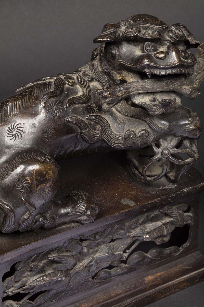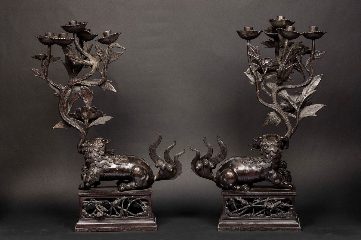 Coppia di candelieri in bronzo a decoro ramages sorretto da cani di Pho, Cina, Dinastia Ming, XVIII secolo