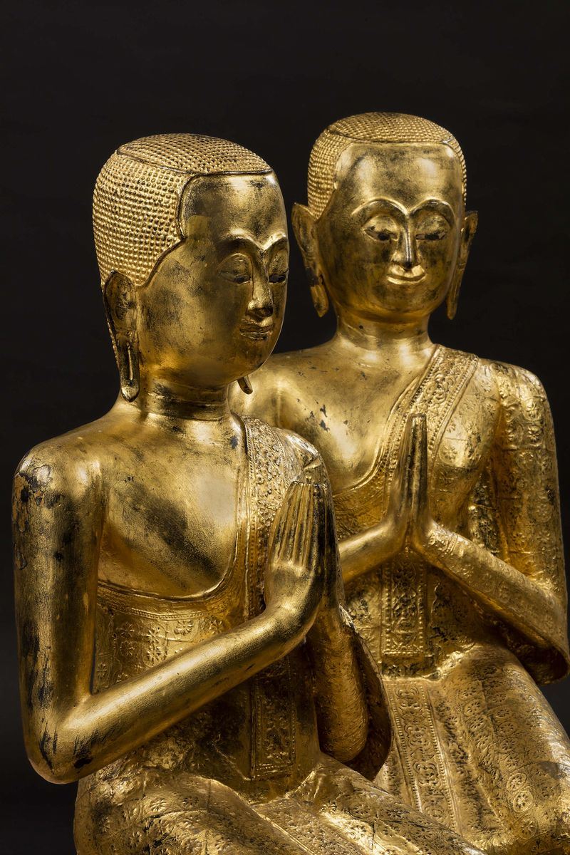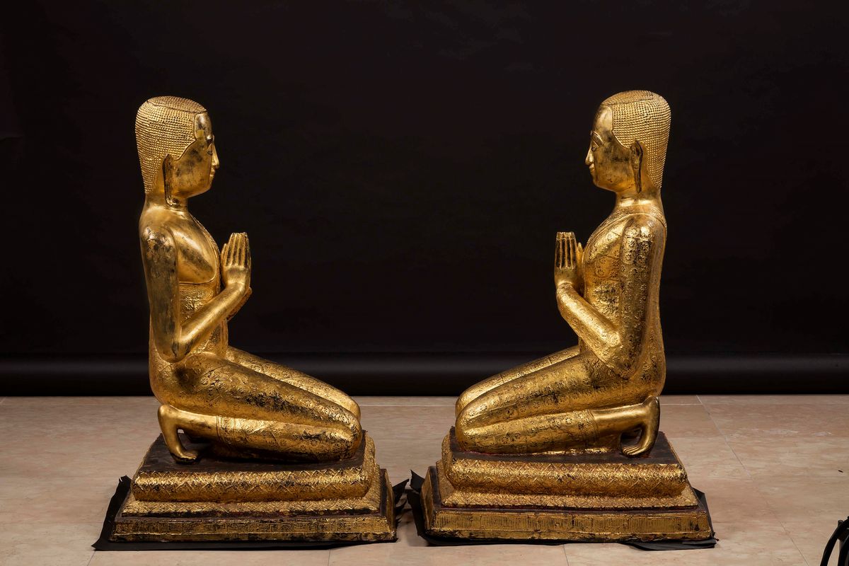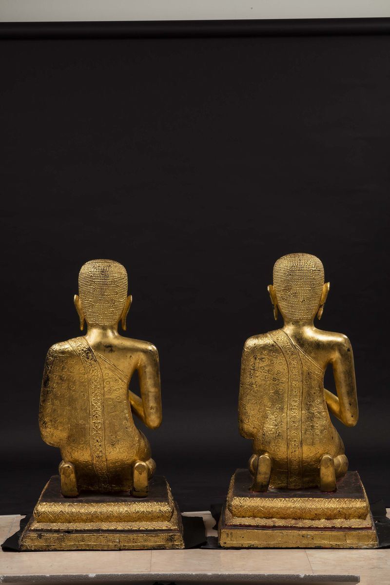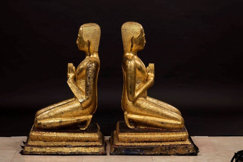 Coppia di sculture in bronzo dorato raffiguranti monaci in preghiera, Thailandia, XX secolo
