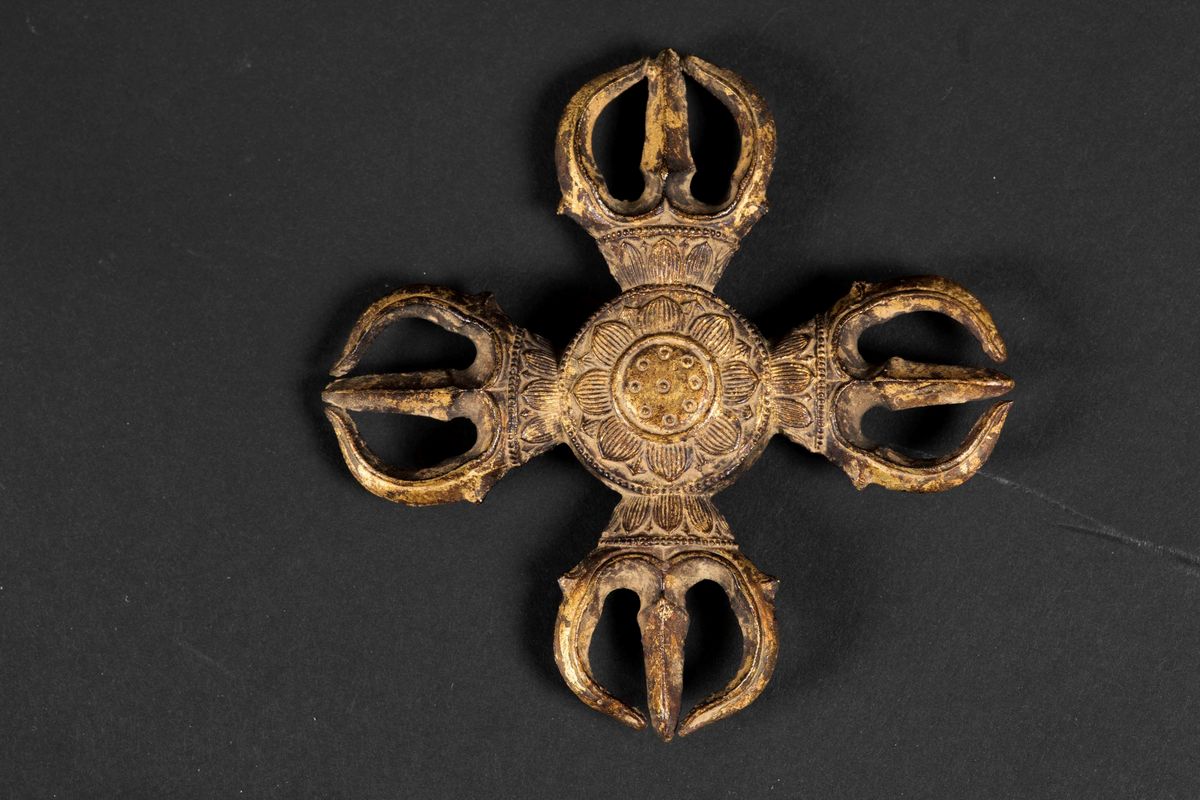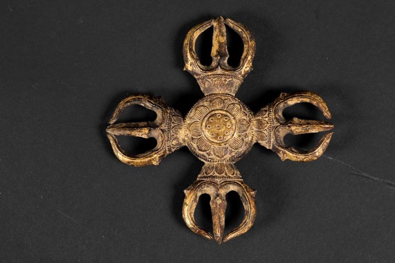 Doppio Karma Vajra con fiore di loto centrale in bronzo dorato, Giappone, Periodo Heian, VIII-IX secolo
