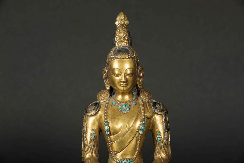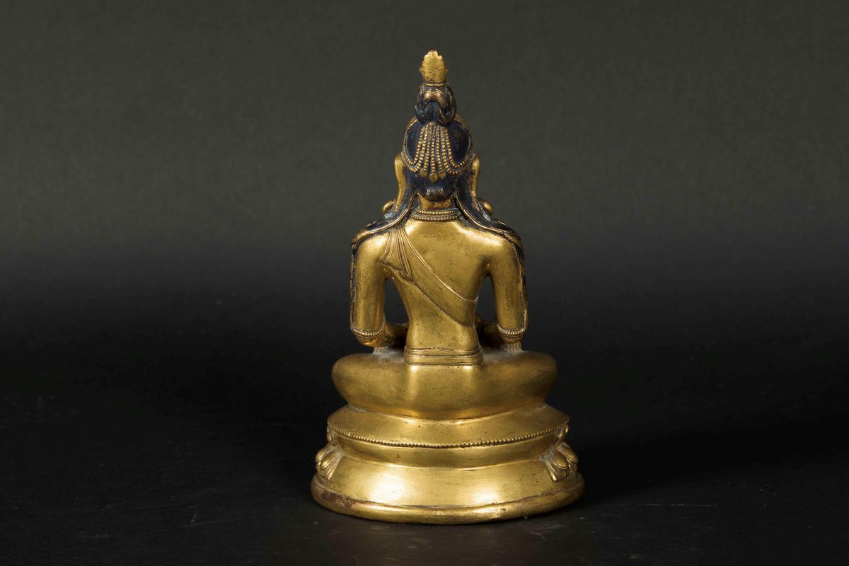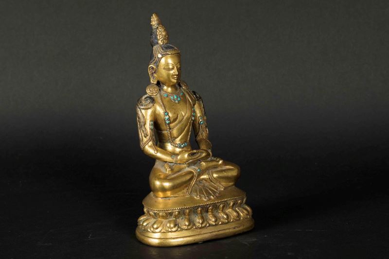 Figura di Amitayus seduto su doppio loto in bronzo dorato con innesti in turchese, Cina, Dinastia Qing, epoca Qianlong(1736-1796)