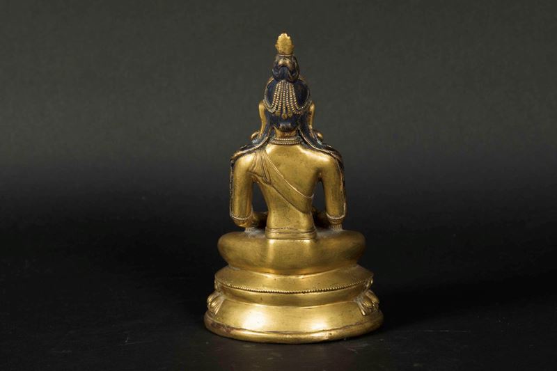 Figura di Amitayus seduto su doppio loto in bronzo dorato con innesti in turchese, Cina, Dinastia Qing, epoca Qianlong(17 [..]