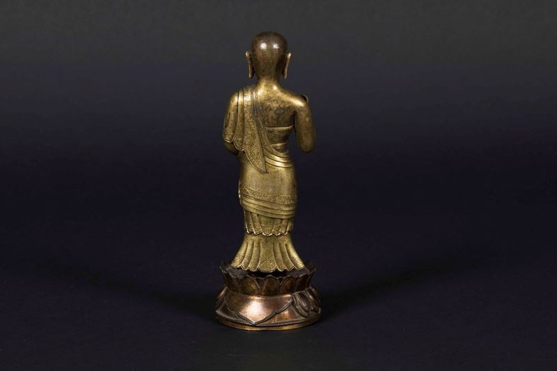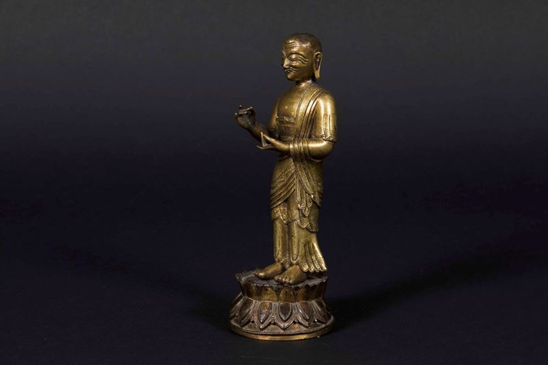 Figura di Arhat eretto in bronzo dorato su doppio fiore di loto, Cina, Dinastia Qing, XVIII secolo