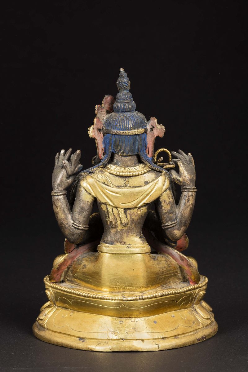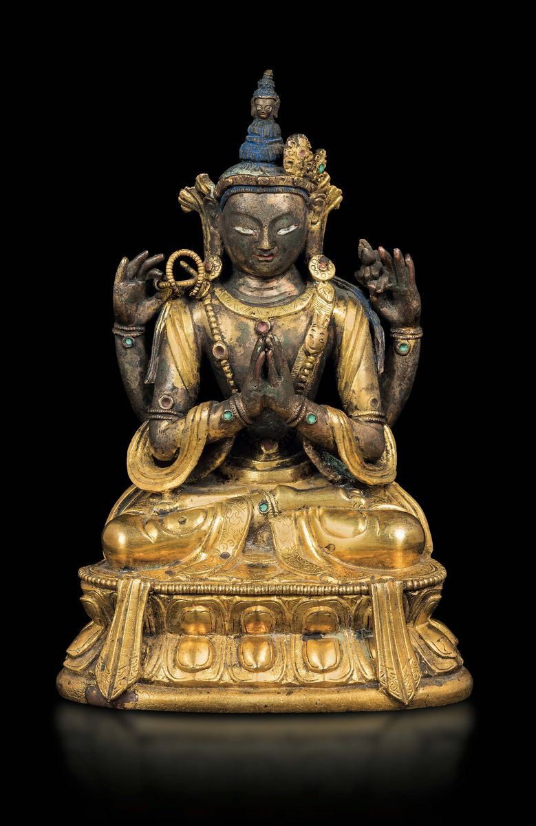 Figura di Bodhisattva Avalokitesvarasadak seduto su doppio fiore di loto in bronzo dorato con innesti in pietre dure, Cina, Dinastia Qing, XVIII secolo
