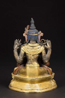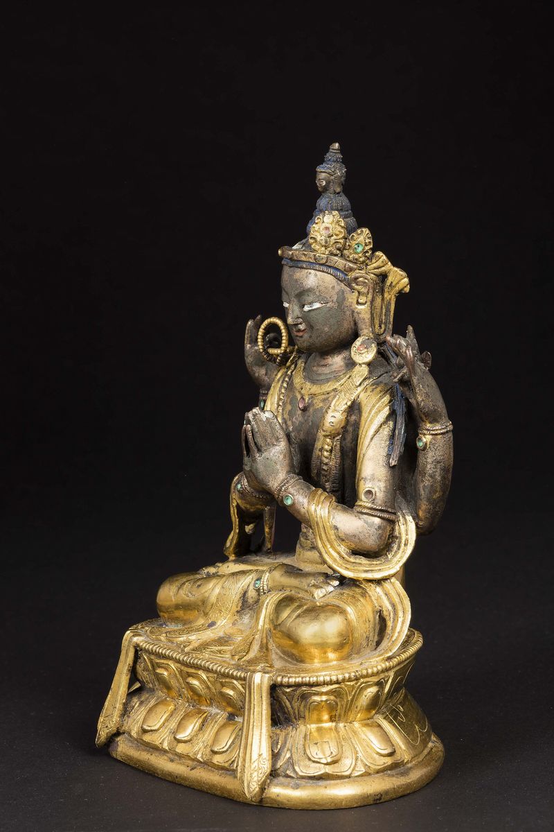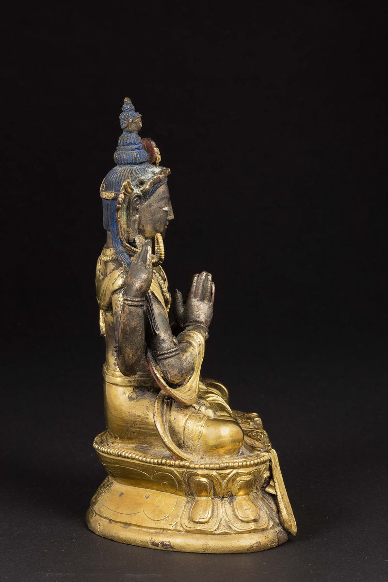 Figura di Bodhisattva Avalokitesvarasadak seduto su doppio fiore di loto in bronzo dorato con innesti in pietre dure, Cina, [..]