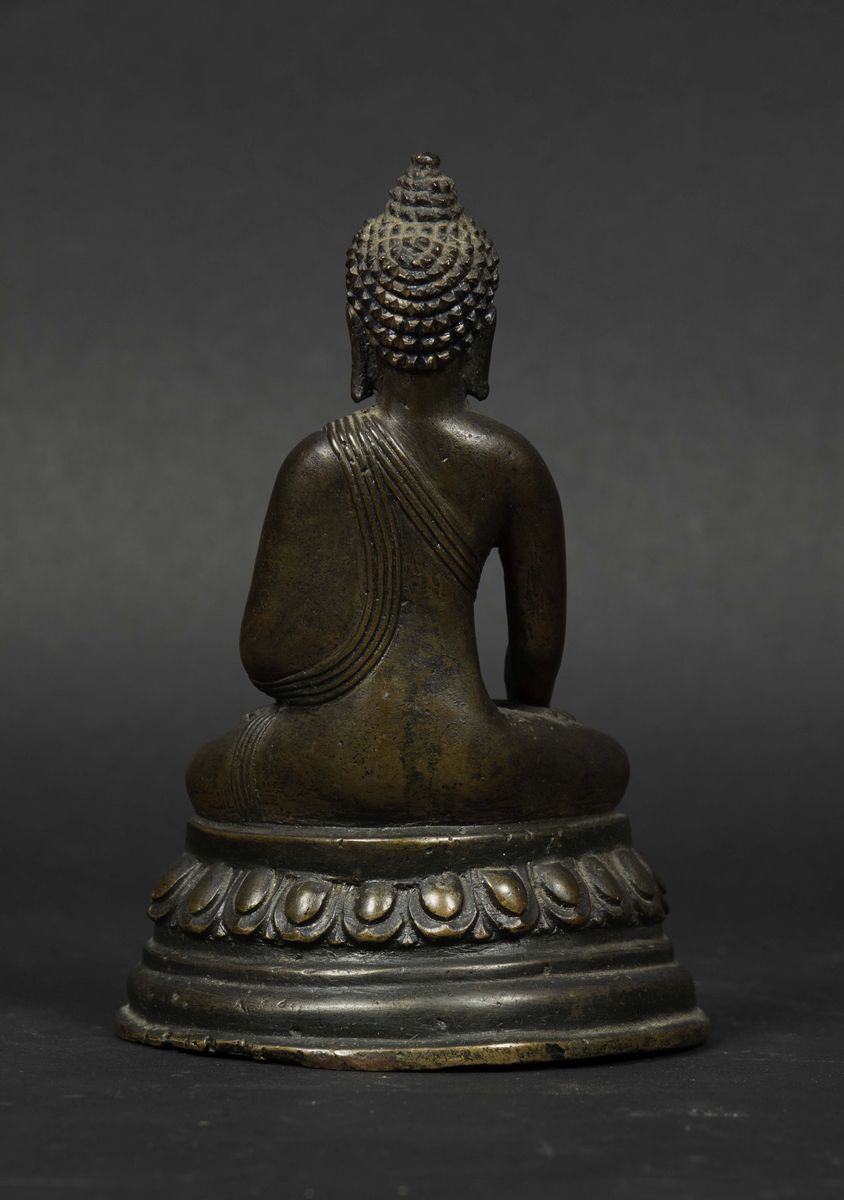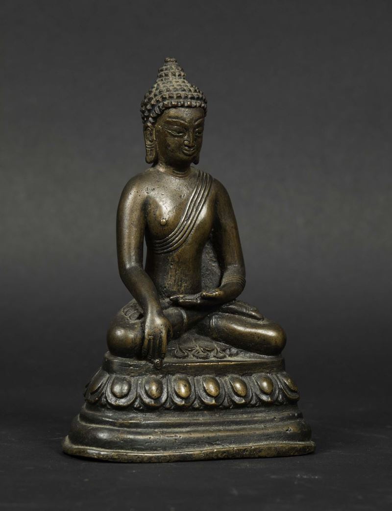 Figura di Buddha Sakyamuni in bronzo seduto su fiore di loto, Tibet, XIV-XV secolo