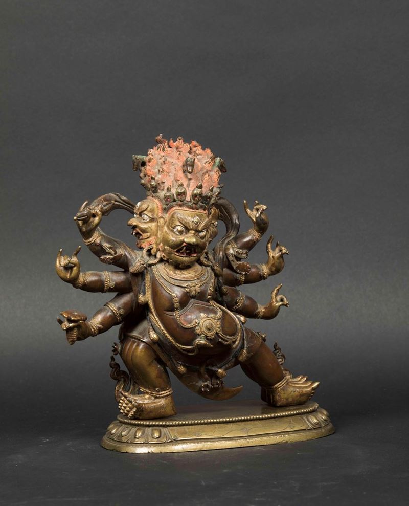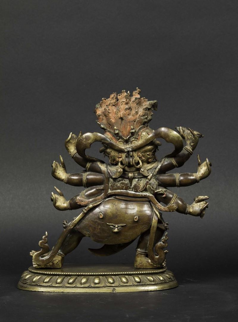 Figura di Krsna-Yamari a più teste con simboli del potere tra le mani in bronzo parzialmente dorato, Cina, Dinastia Qing, [..]