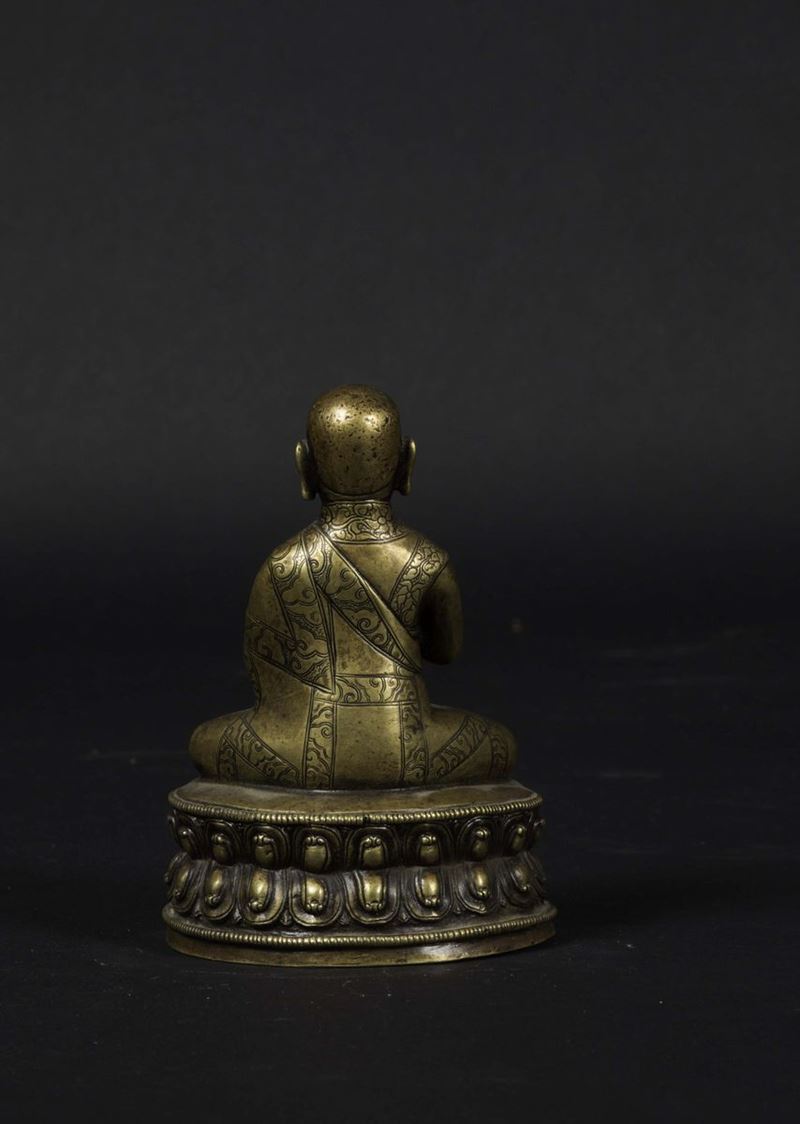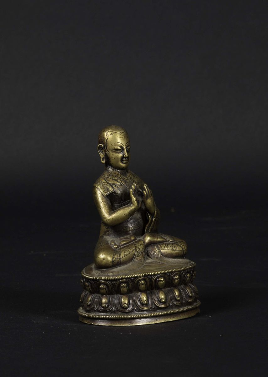 Figura di monaco Sakya-master seduto su doppio fiore di loto in bronzo cesellato, Tibet, XIV-XV secolo