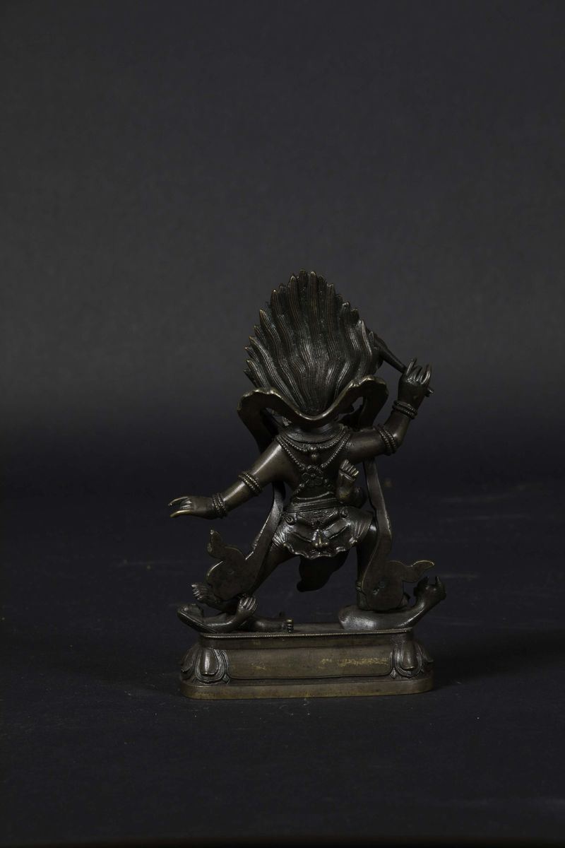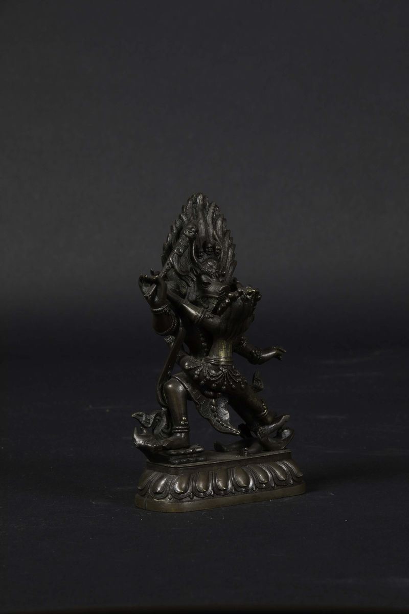Figura di Outer-Yama in bronzo con tracce di doratura eretto su fiore di loto, Tibet, XVII-XVIII secolo