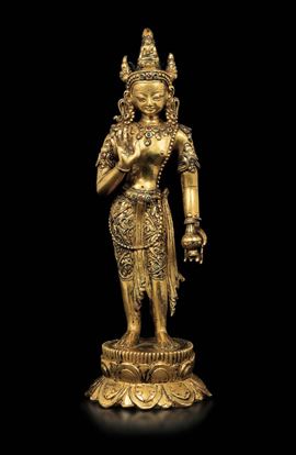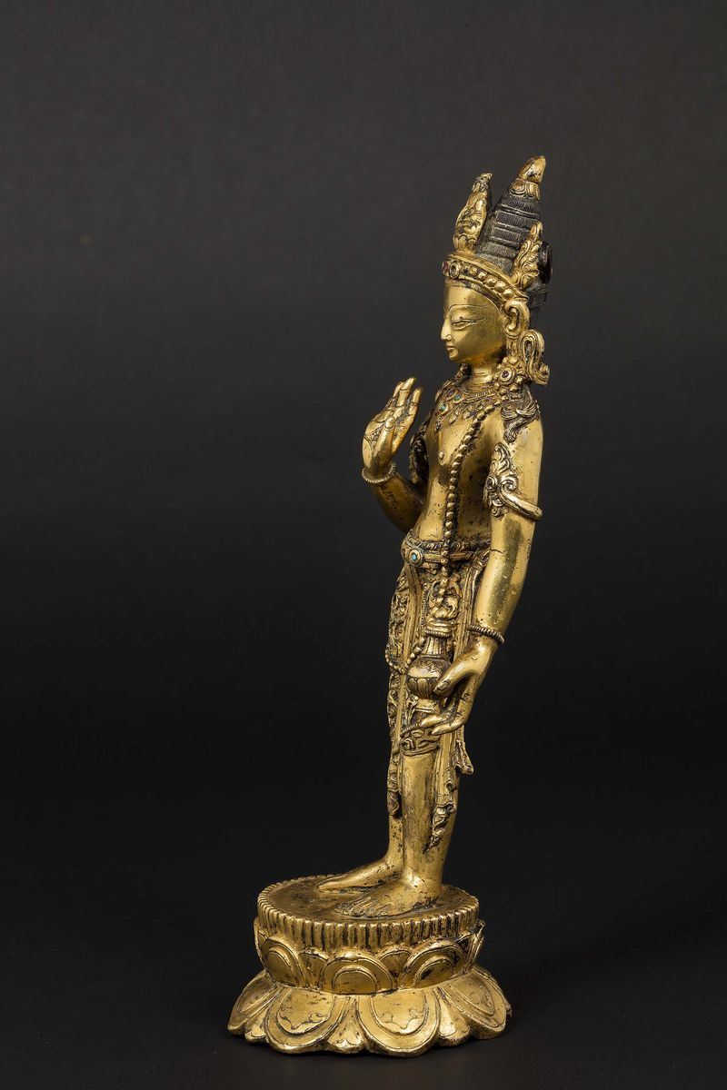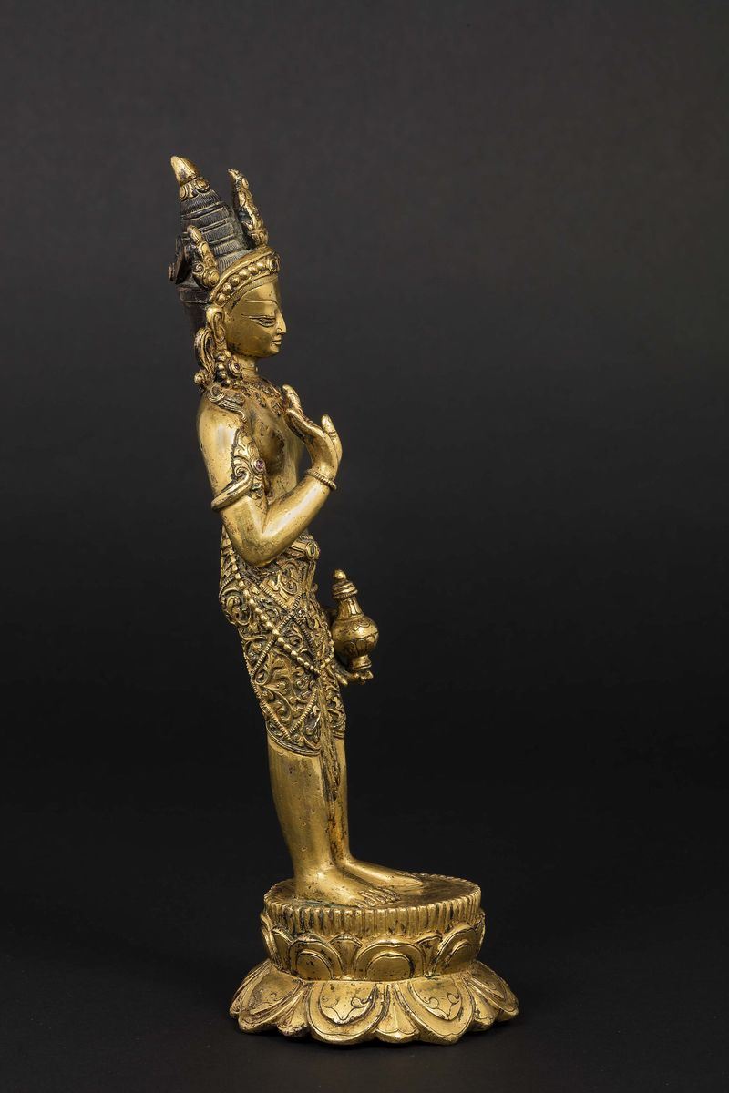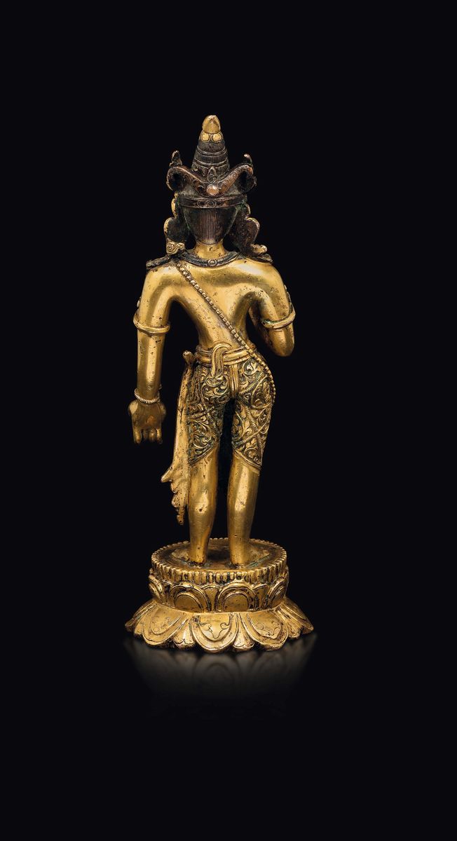 Figura di Padmapani eretto su doppio fiore di loto in bronzo dorato, Mongolia, scuola di Zanabazar, fine XVIII secolo