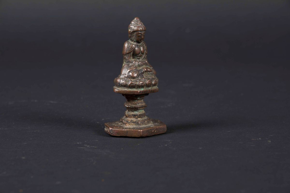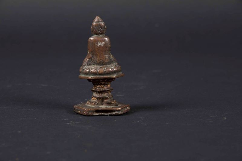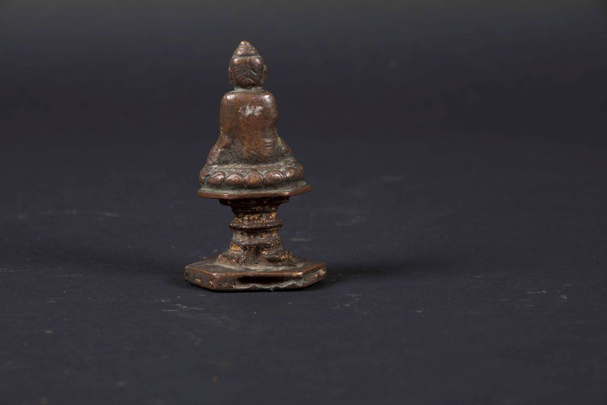 Figura di Sakyamuni in bronzo con tracce di doratura, Cina, Dinastia Ming, XV secolo