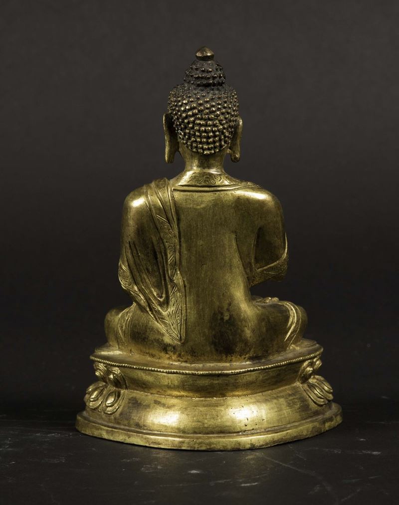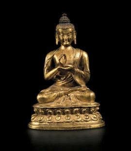 Figura di Sakyamuni in bronzo dorato seduto su doppio fiore di loto, Cina, Dinastia Qing, epoca Kangxi (1662-1722)