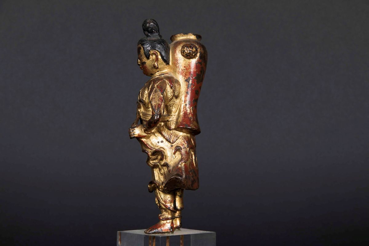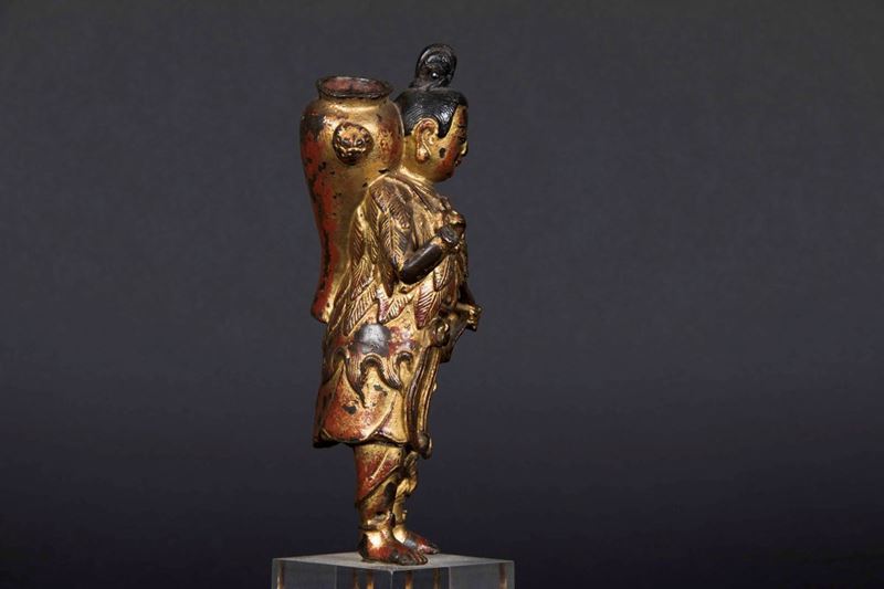 Figura di uomo con vaso sulla schiena in bronzo dorato a freddo e con tracce di laccatura, Cina, Dinastia Ming, XVII secolo