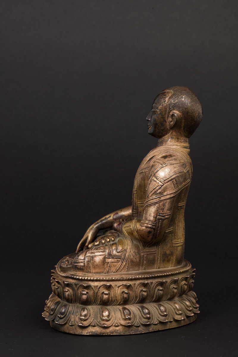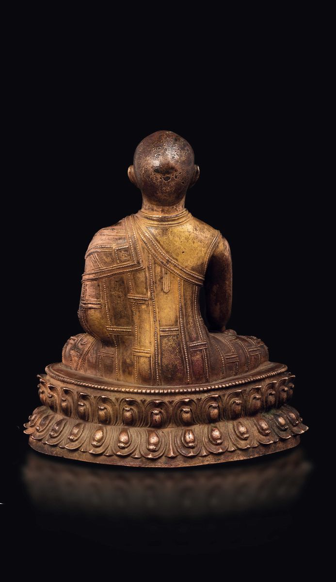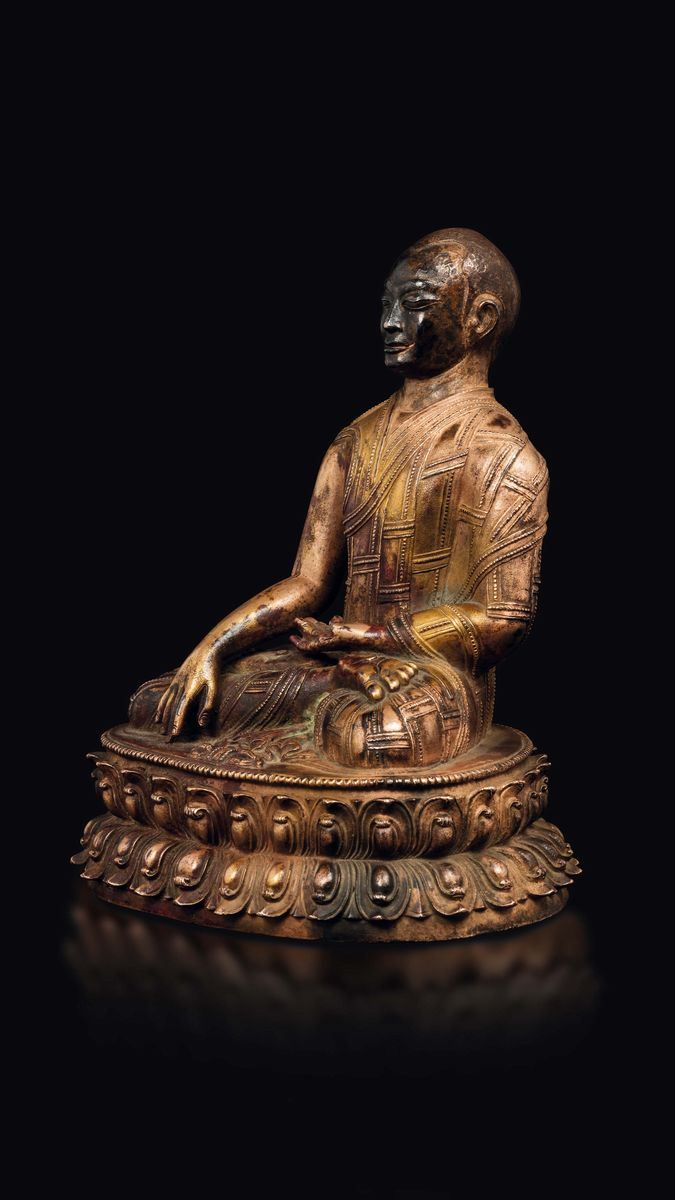 Importante figura imperiale di Lama seduto su doppio fiore di loto in bronzo dorato, Tibet, XIII secolo