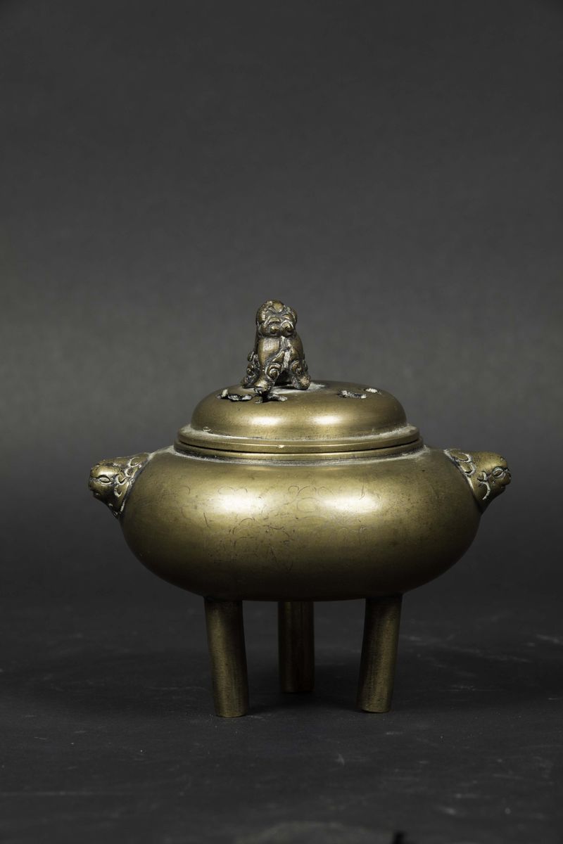 Incensiere tripode in bronzo dorato con manici a mascheroni e coperchio sormontato da cane di Pho, Cina, Dinastia Qing, [..]