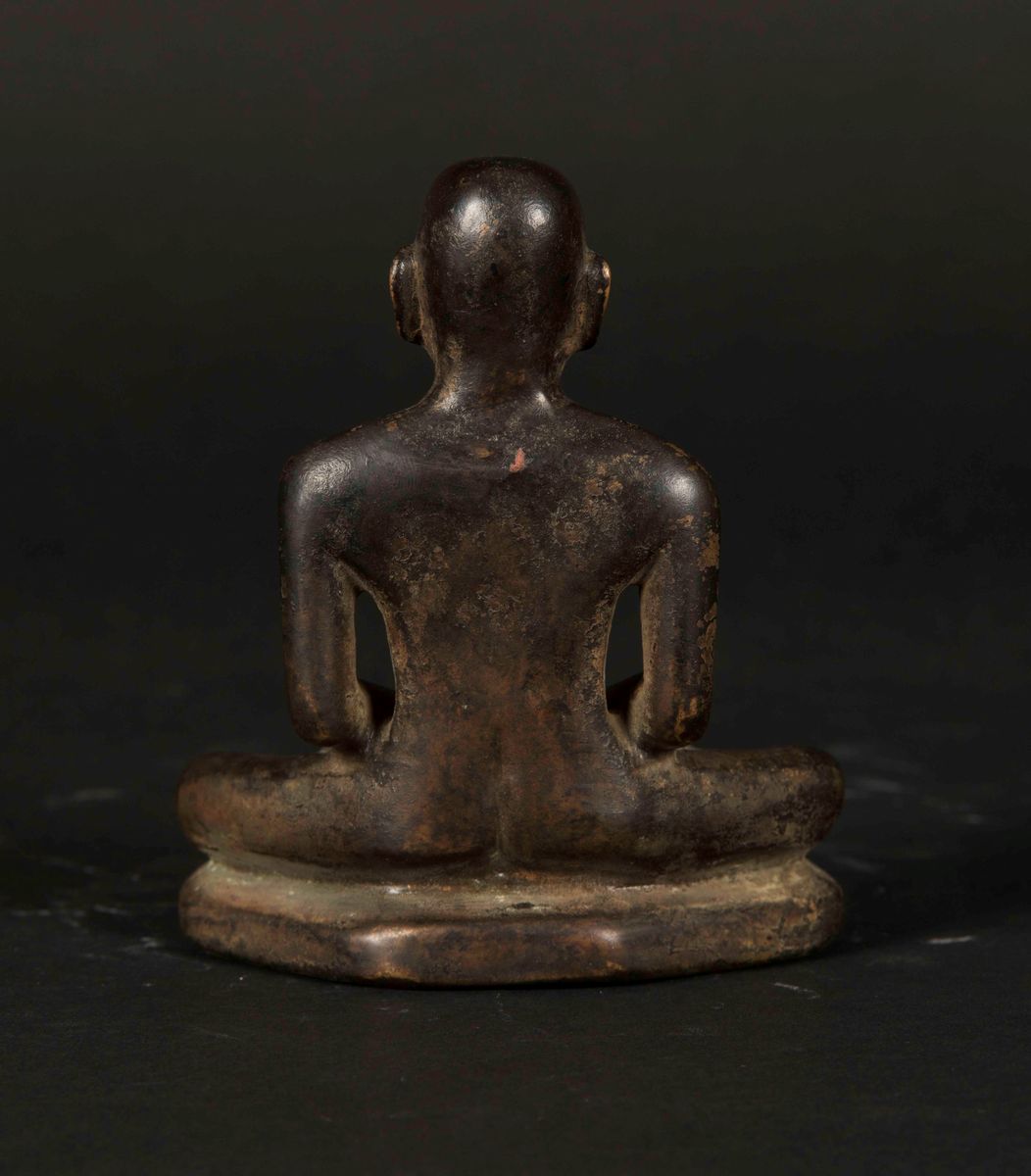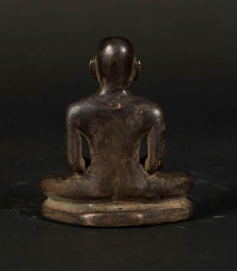 Scultura in bronzo con tracce di doratura raffigurante monaco in preghiera, Tibet, XIX secolo