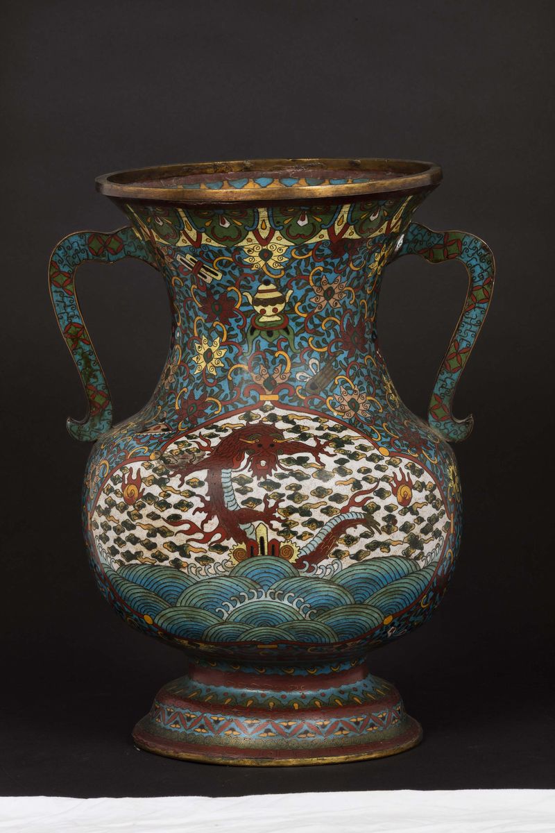 Vaso ad anse a smalti cloisonné con figura di drago entro riserva, Cina, Dinastia Qing, metà XIX secolo