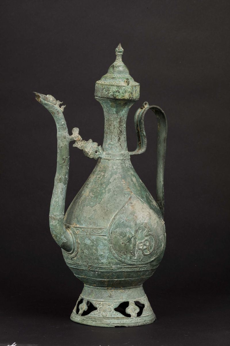 Versatoio in bronzo verde rame con forma arabeggiante e ideogramma della felicità a rilievo, Cina, Dinastia Ming, XVI sec [..]