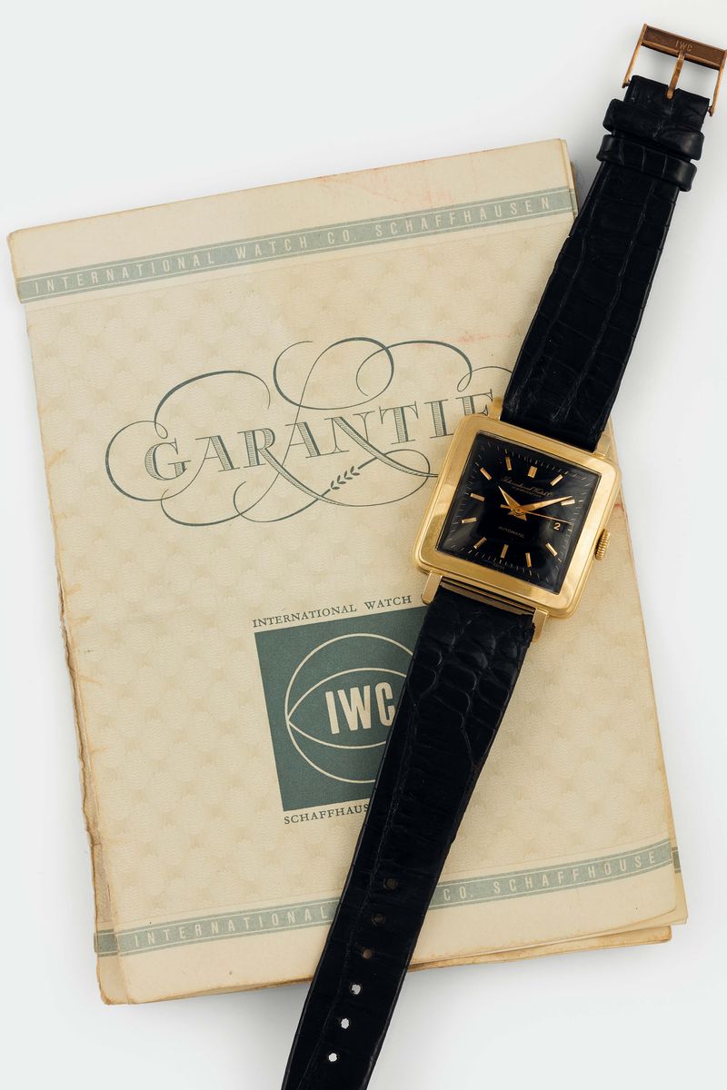 IWC, International Watch Co, Schaffhausen, Automatic , CIOCCOLATONE , cassa No. 1314744. raro, orologio da polso, di forma, in oro giallo 18K automatico, con datario e fibbia originale placcata oro. Accompagnato dalla scatola originale e Garanzia. Venduto nel 1958